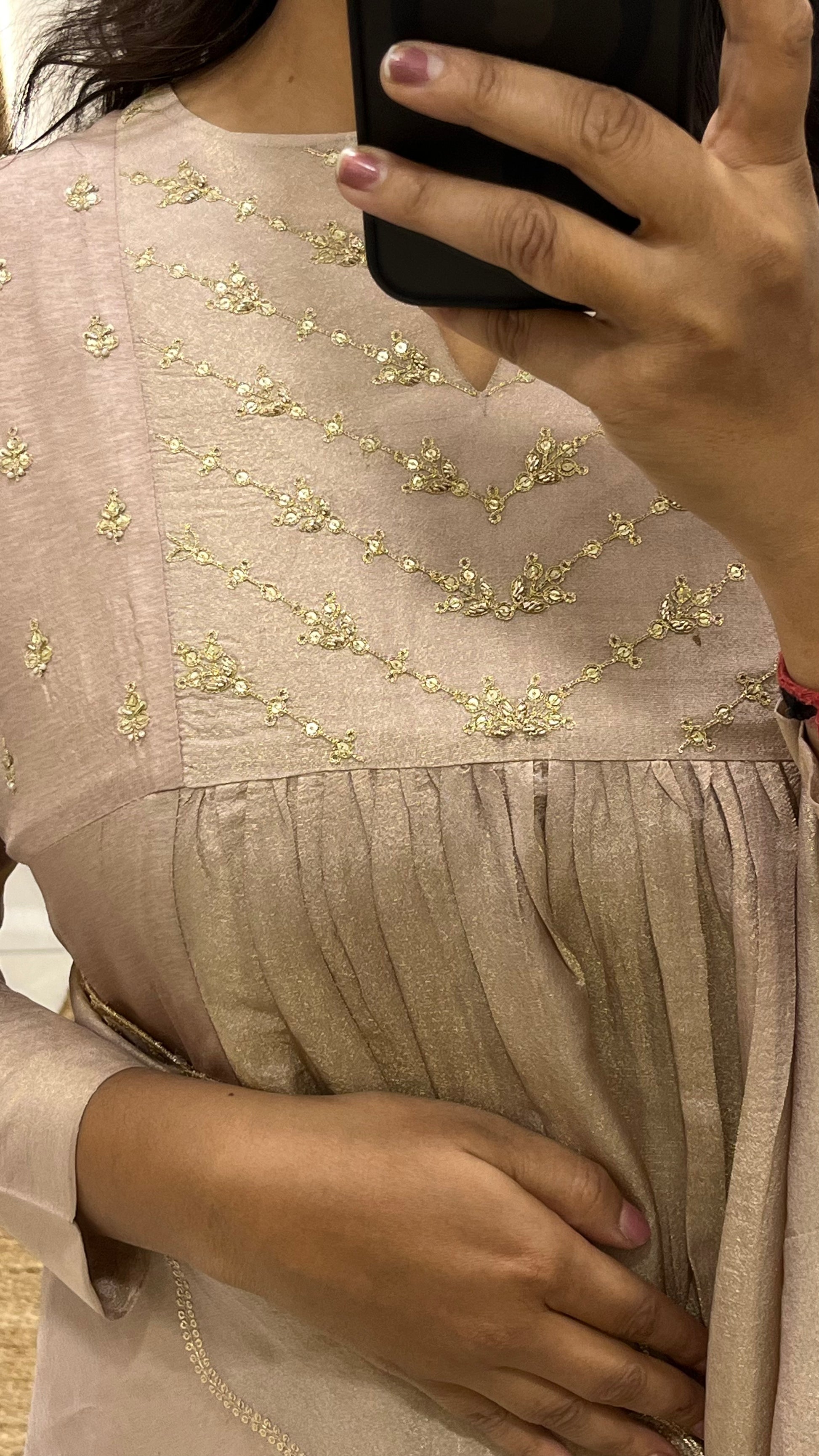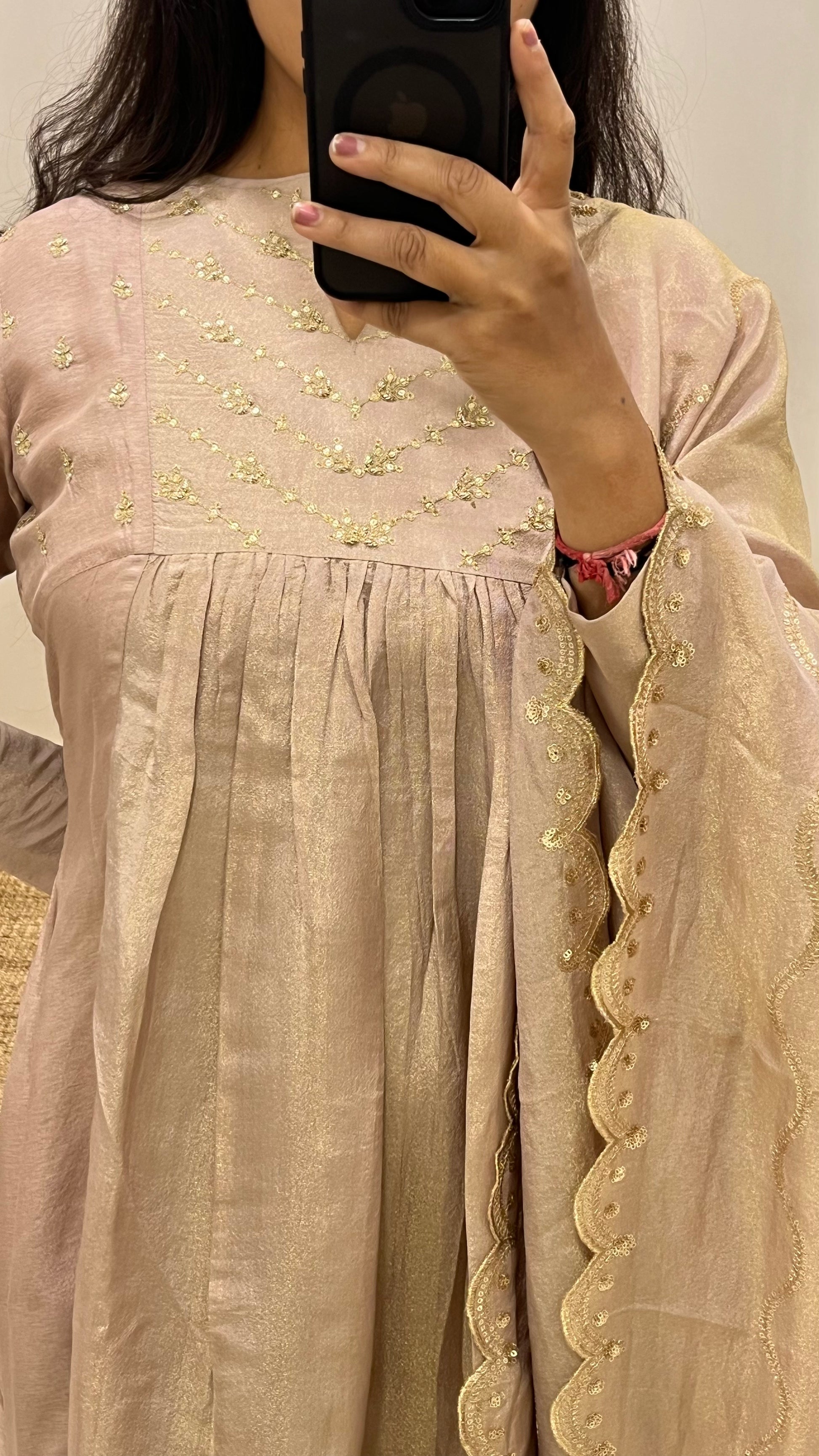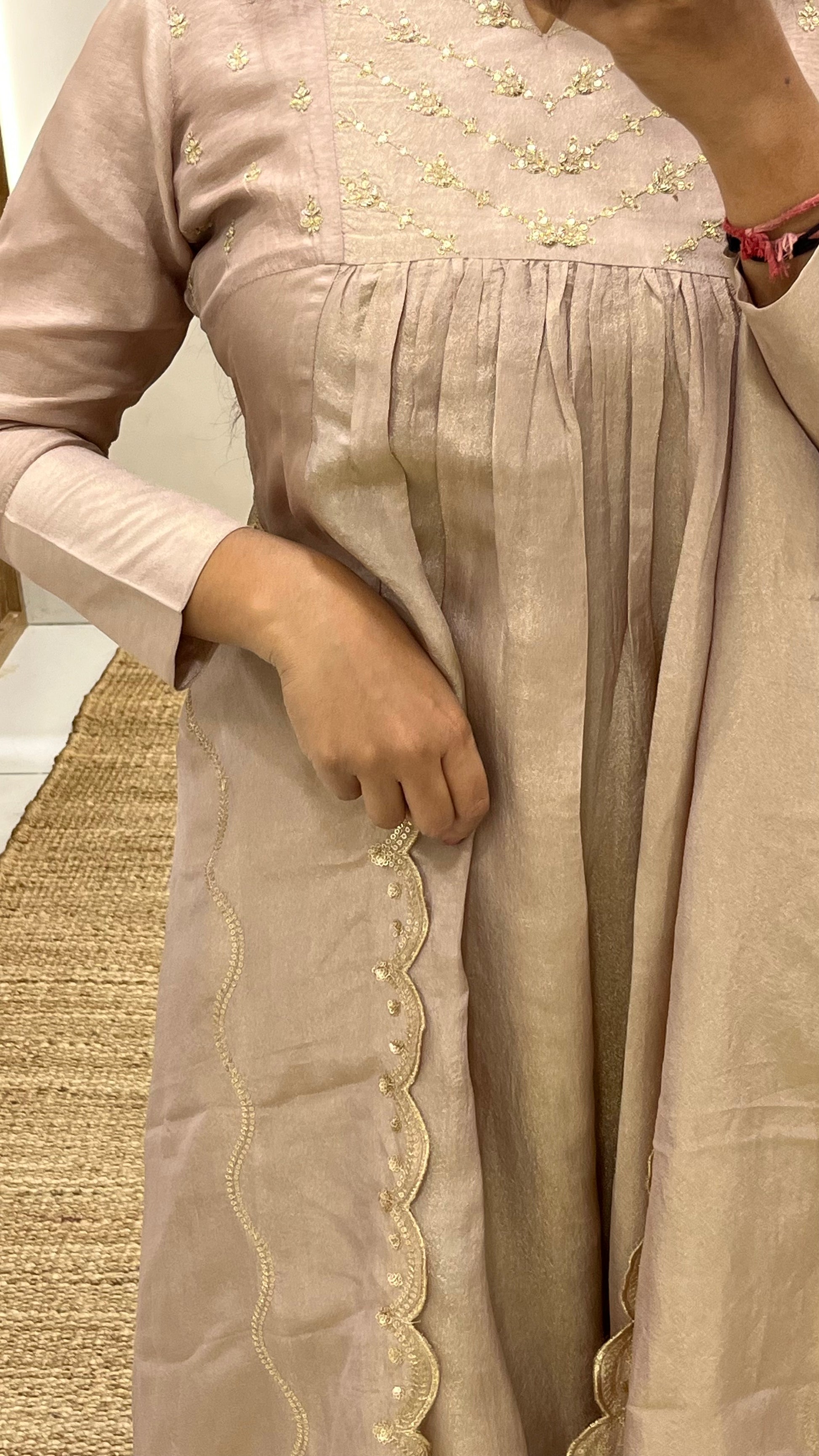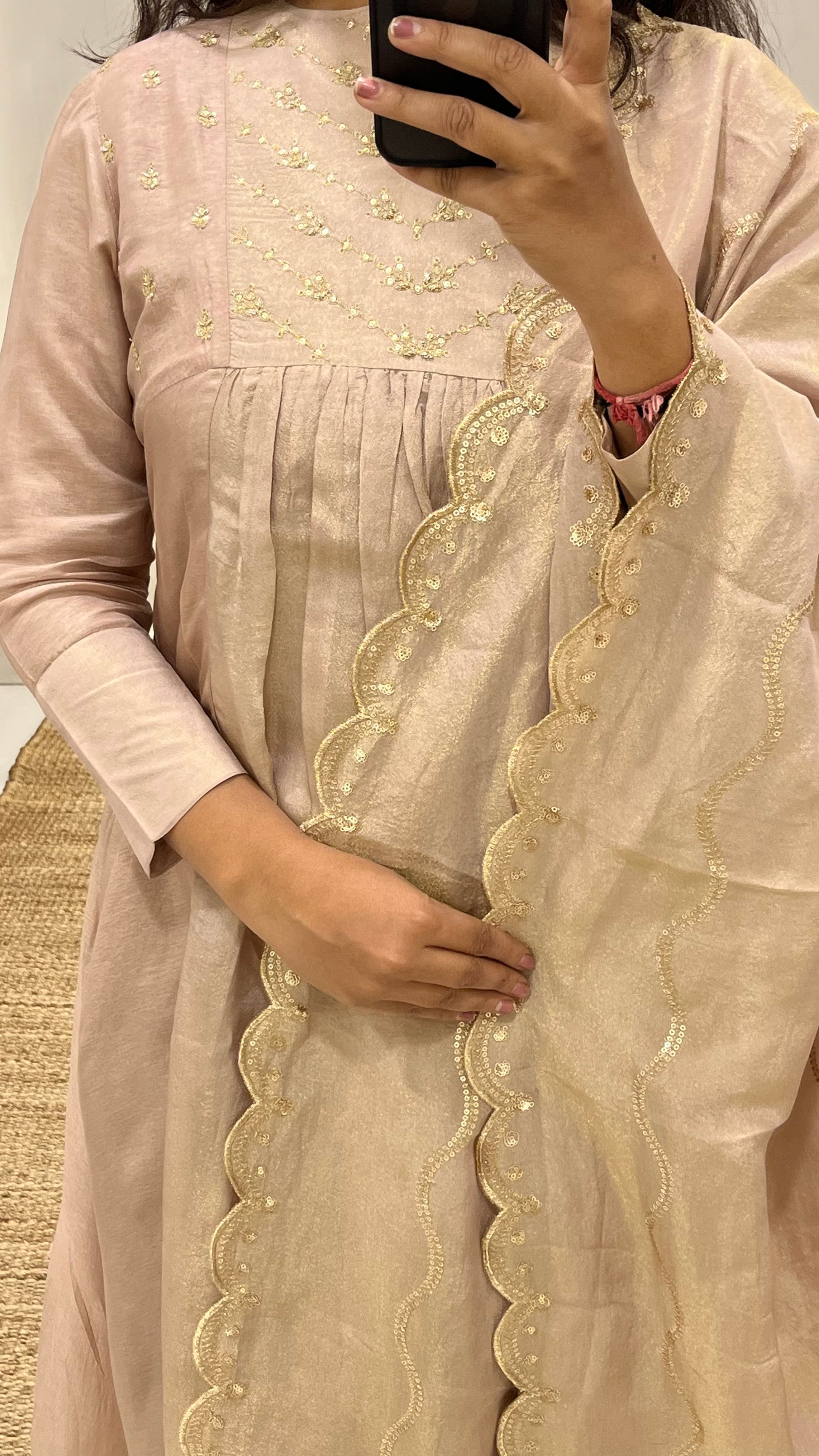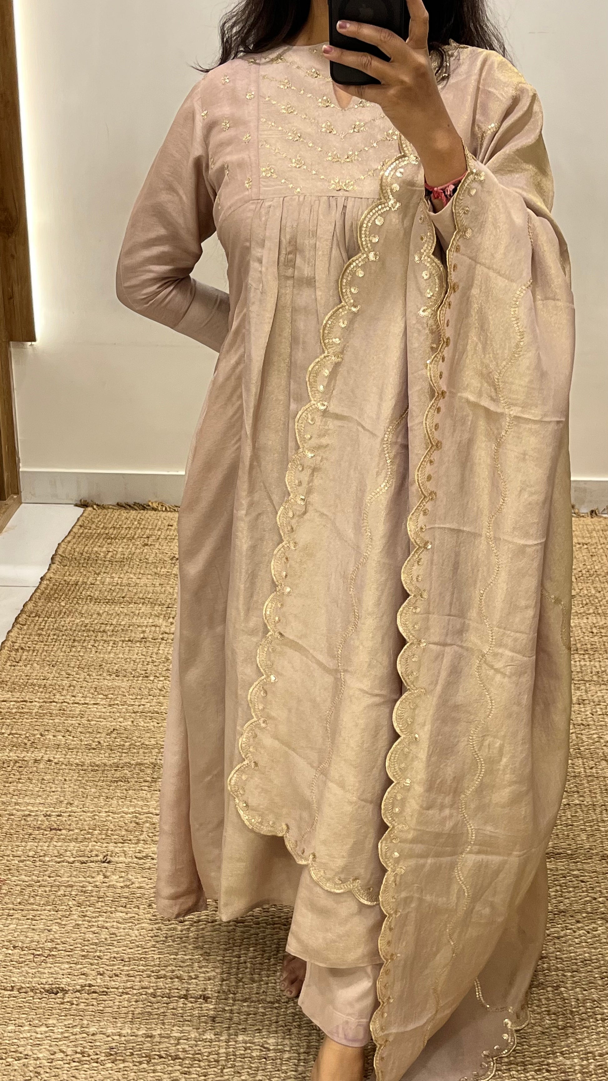 A sophisticated beige suit set crafted from a blend of tissue and Russian silk fabrics. Featuring intricate khat work on the yoke, this elegant ensemble is paired with a delicate tissue dupatta and matching pants. A timeless piece, it's a perfect addition to any bridal trousseau.