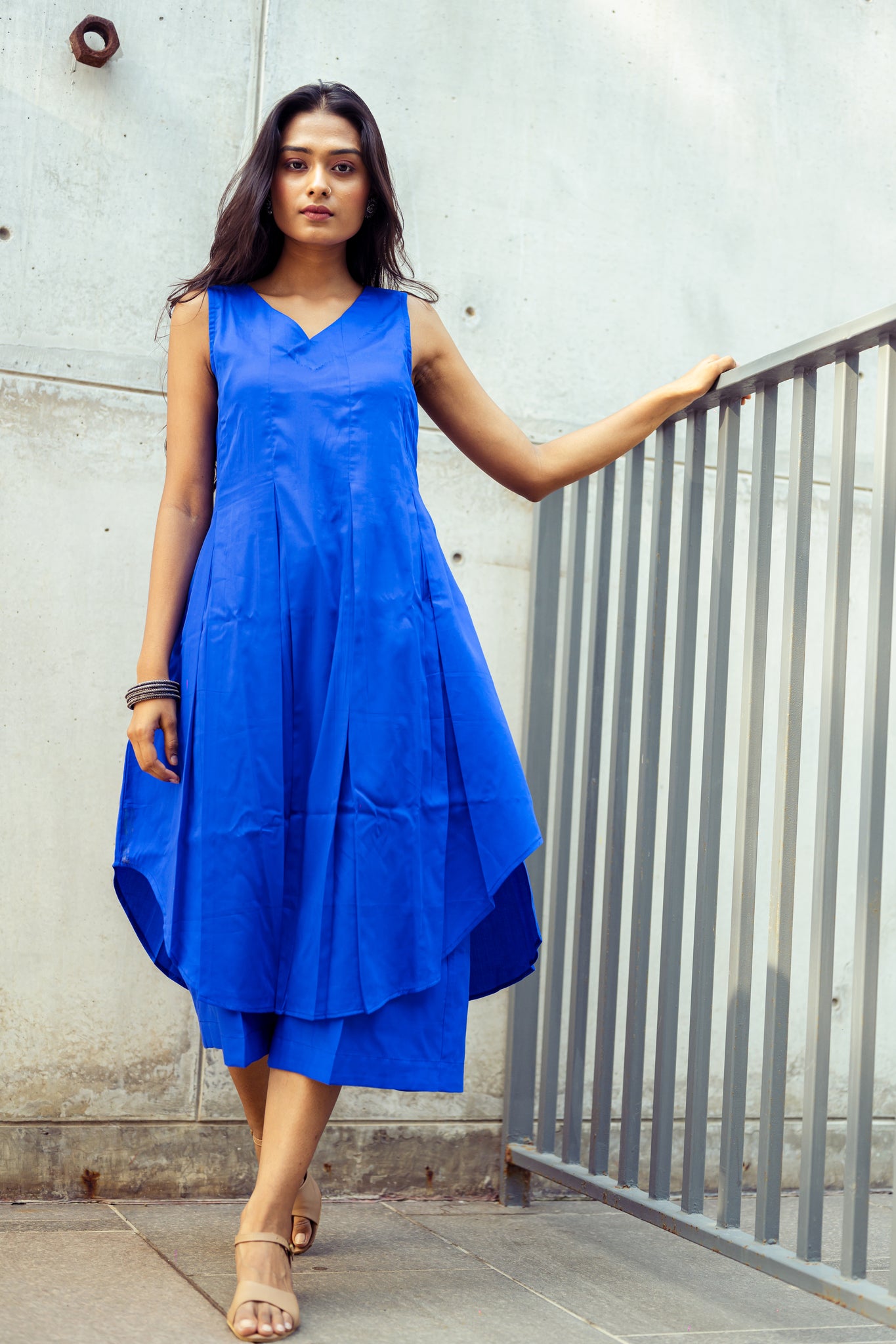 Electric blue co-ord set is perfect for a brunch date or a casual outing. The striking blue in cotton silk is sure to steal the lime light. Detailed with pleating and asymmetrical hemline and paired with cropped pants, this piece is a must have. Pockets in kurta makes it more functional.