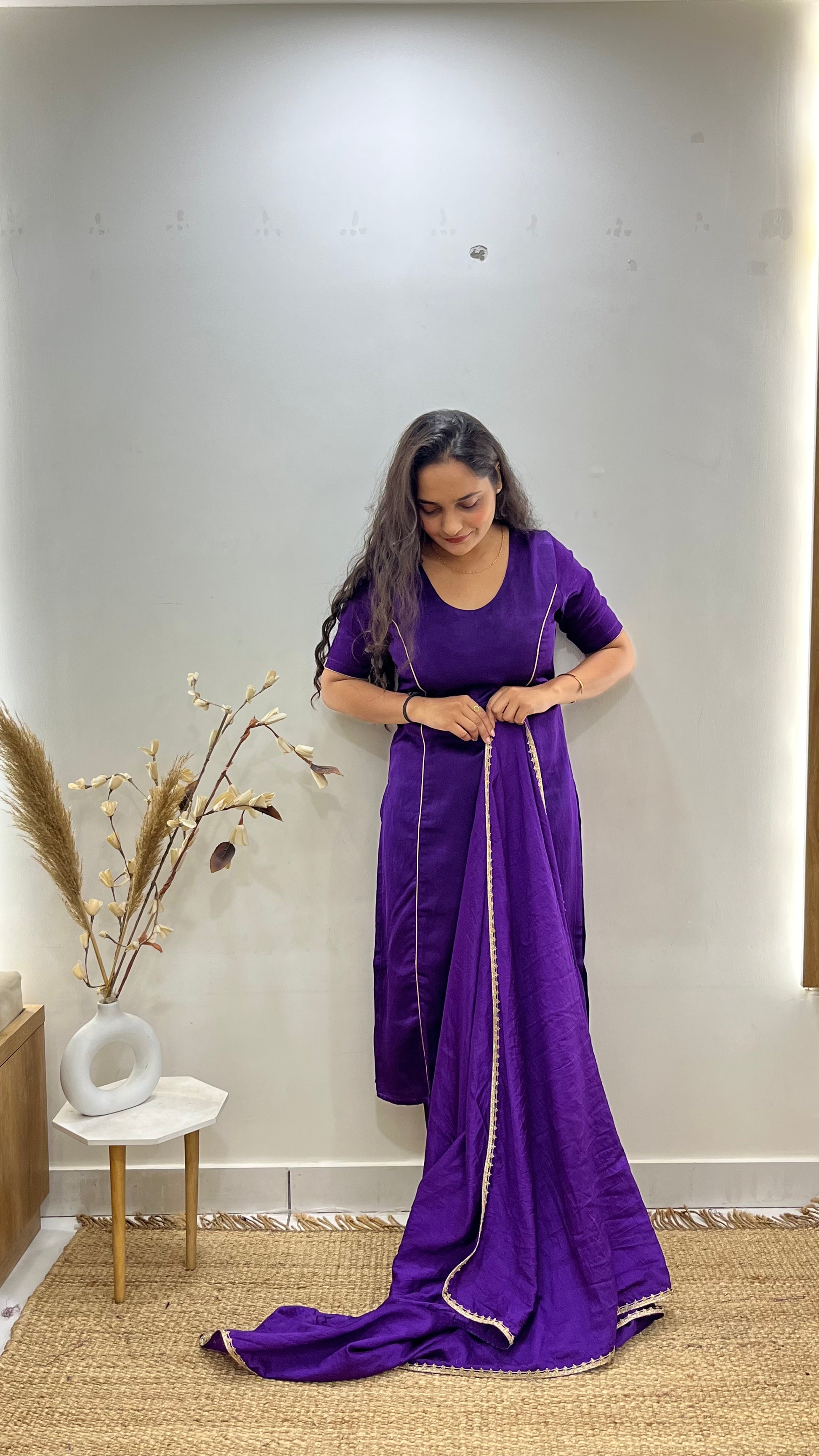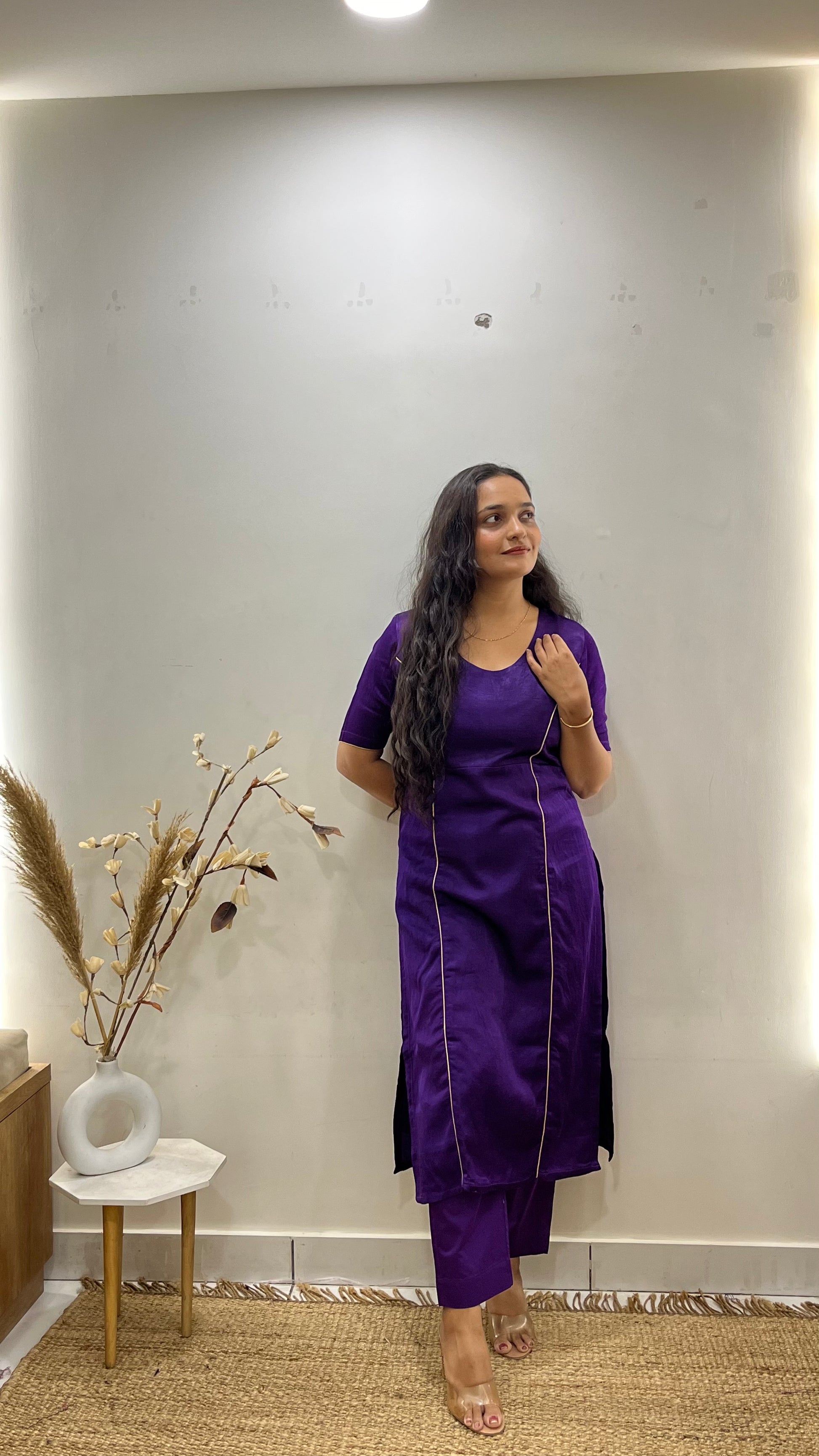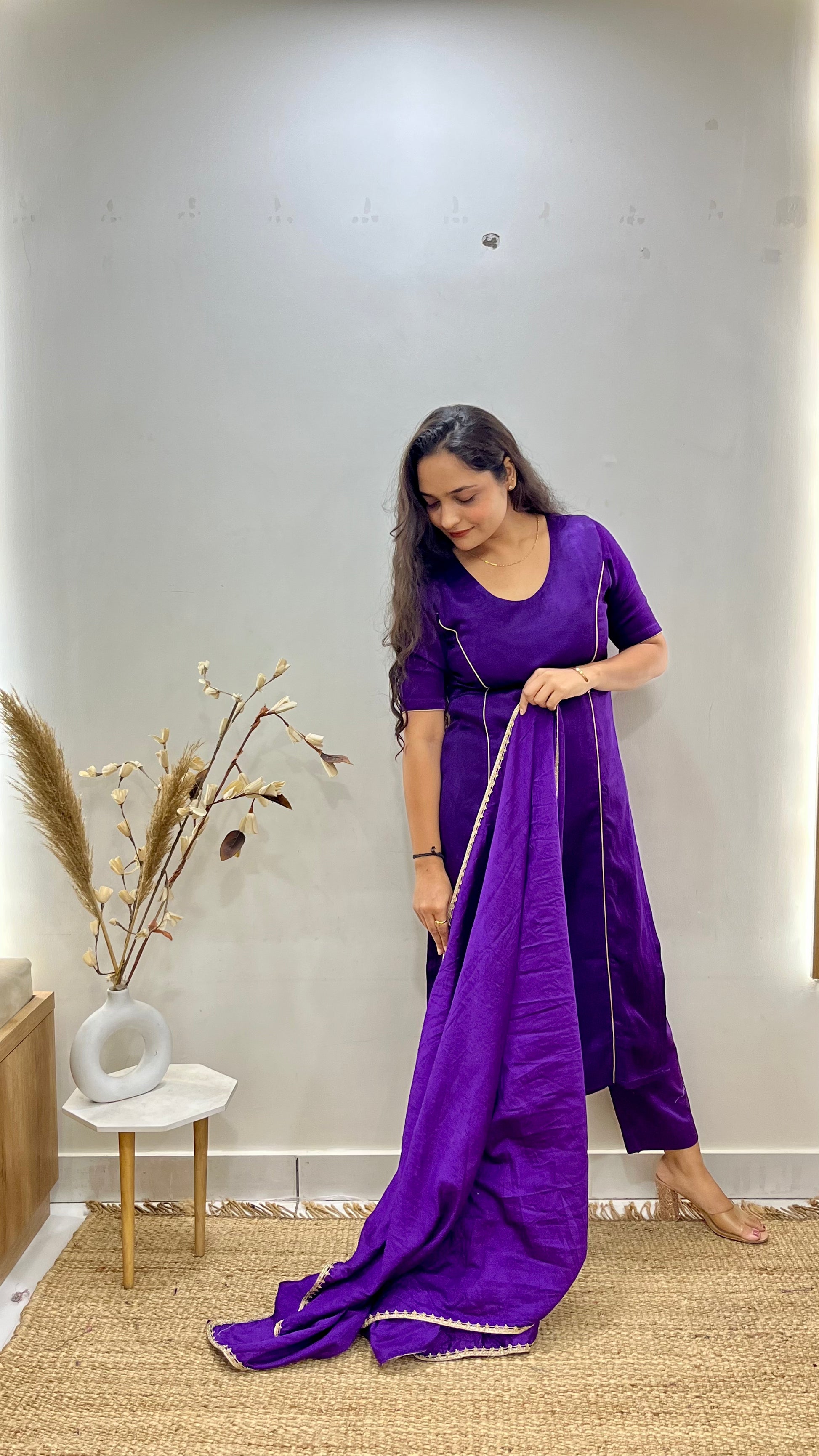 Bold and beautiful three-piece suit set in hues of purple will make you stand out of the crowd. Top is tailored in princess cut and is tactfully covered with golden piping. The chanderi dupatta is decorated with zari lace across all four sides. Paired with straight cut pants.