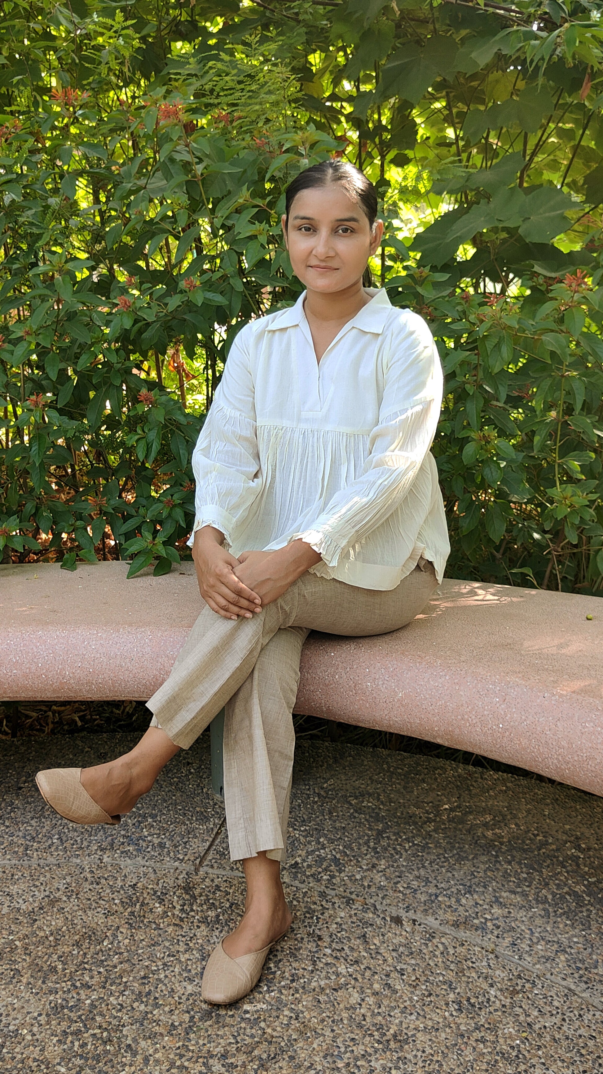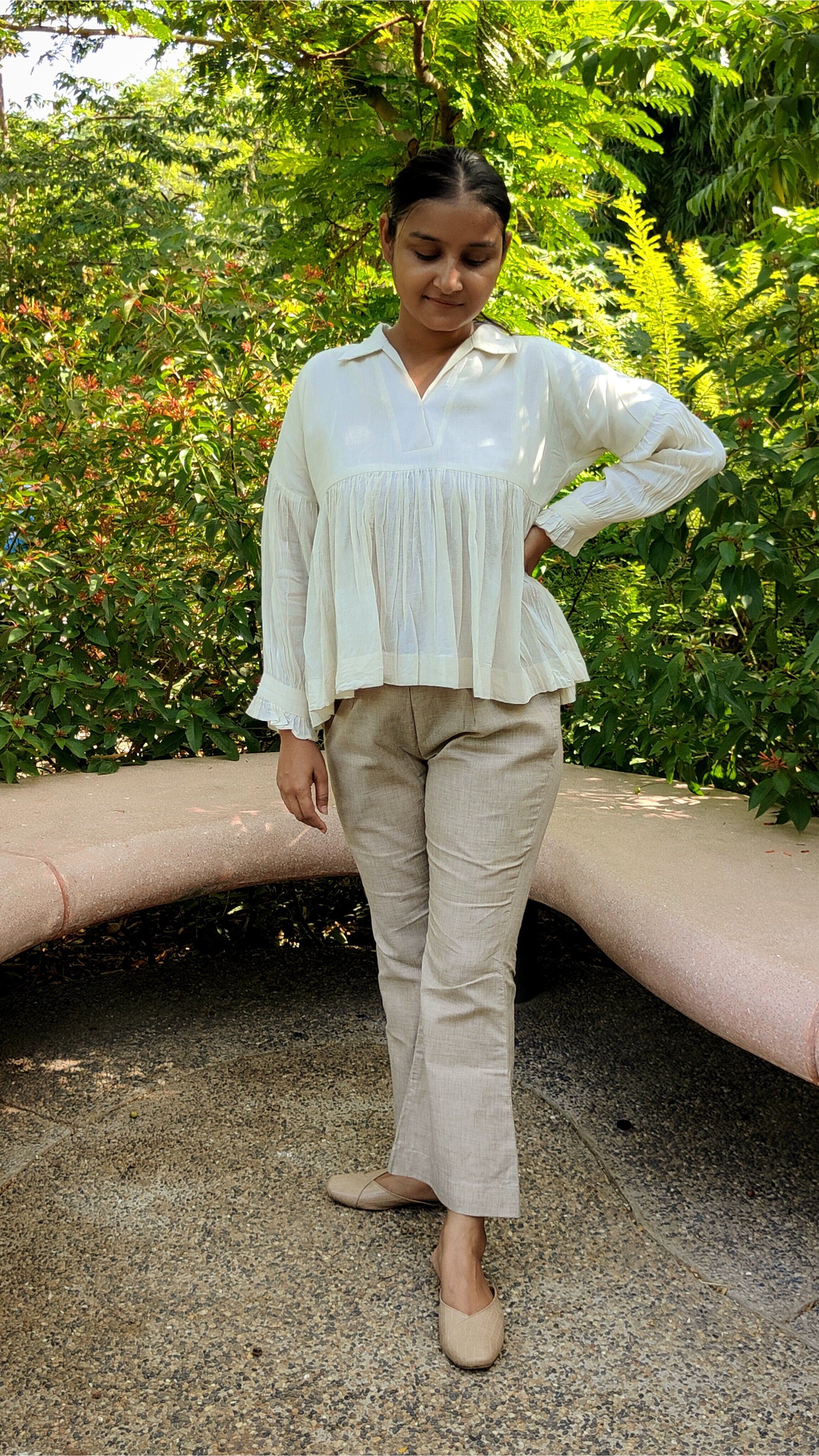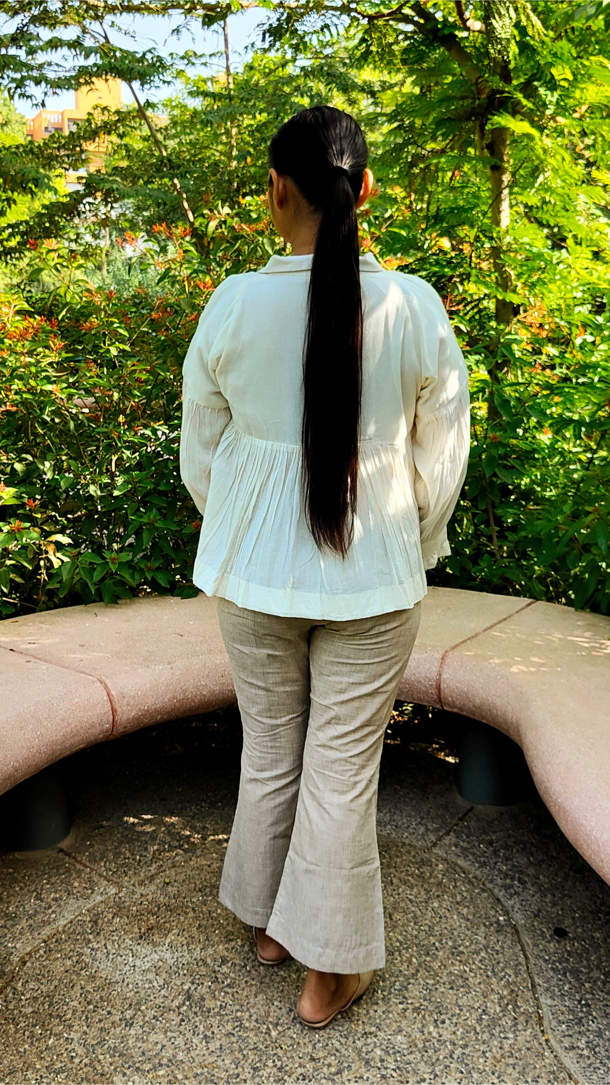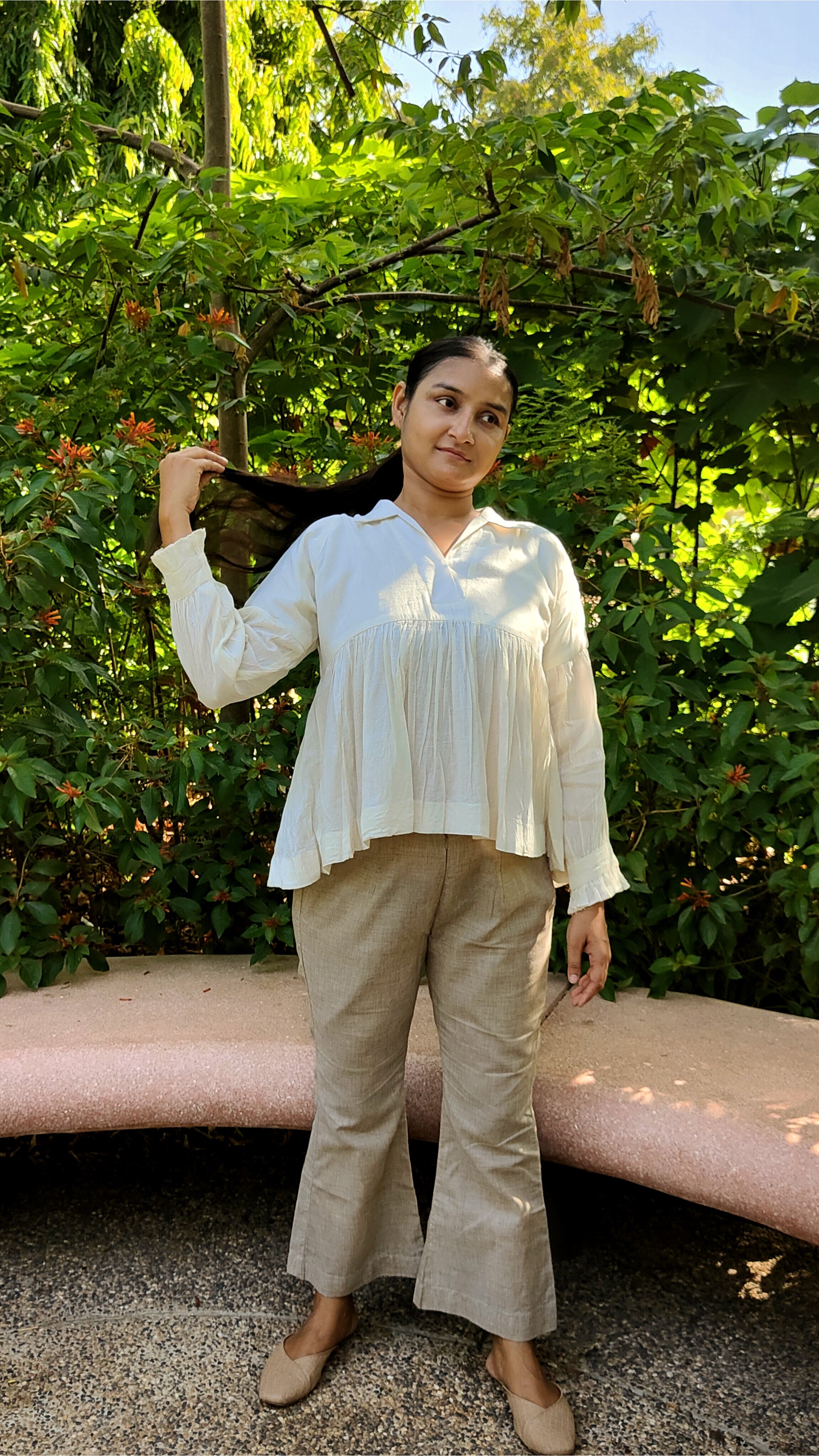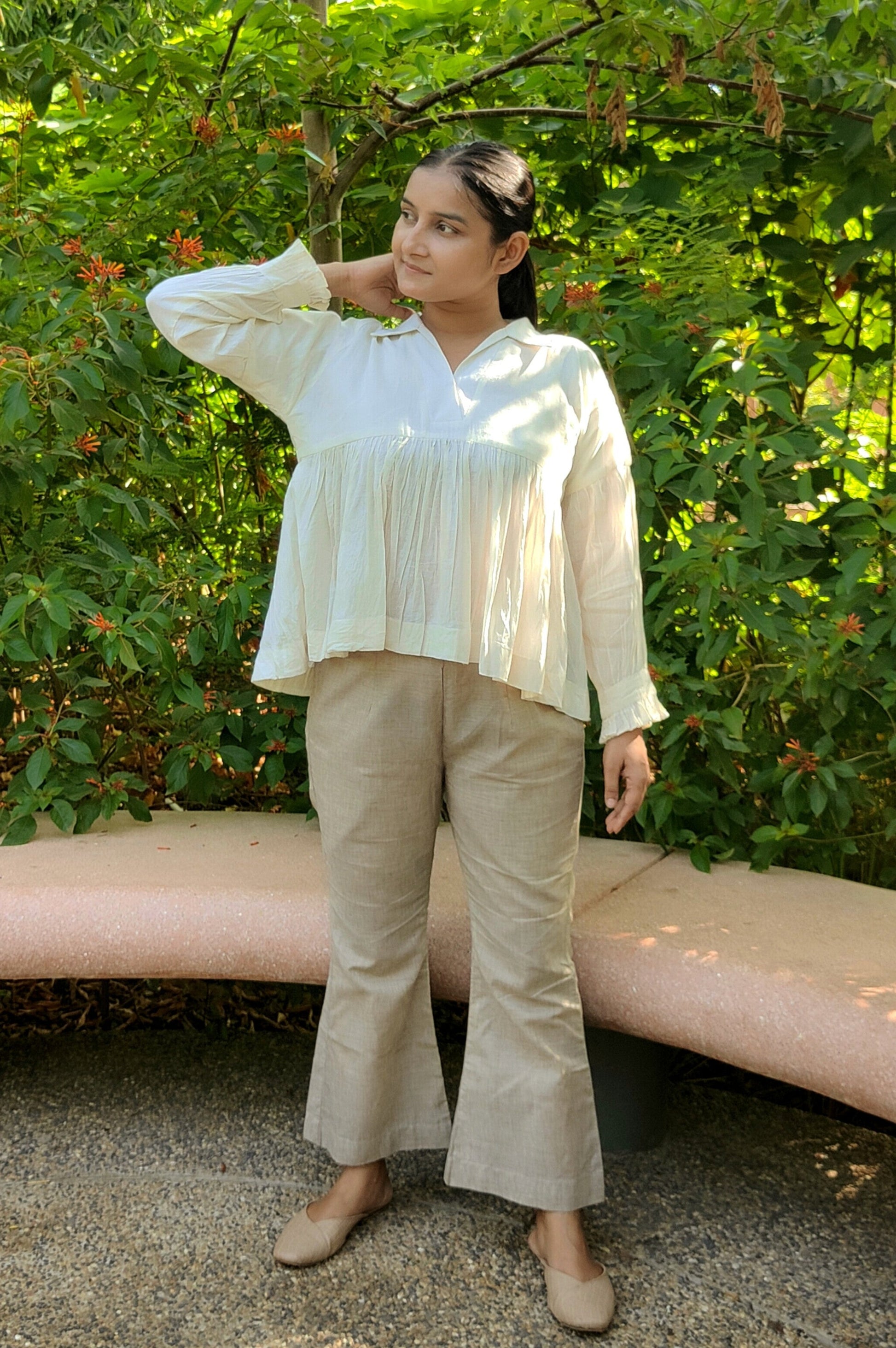 The White and Beige Cotton Coord Set with Full Sleeves Top and Bell Bottom Trousers. The full sleeves top is a masterpiece of cuts and craftsmanship, designed to be super stylish and chic.