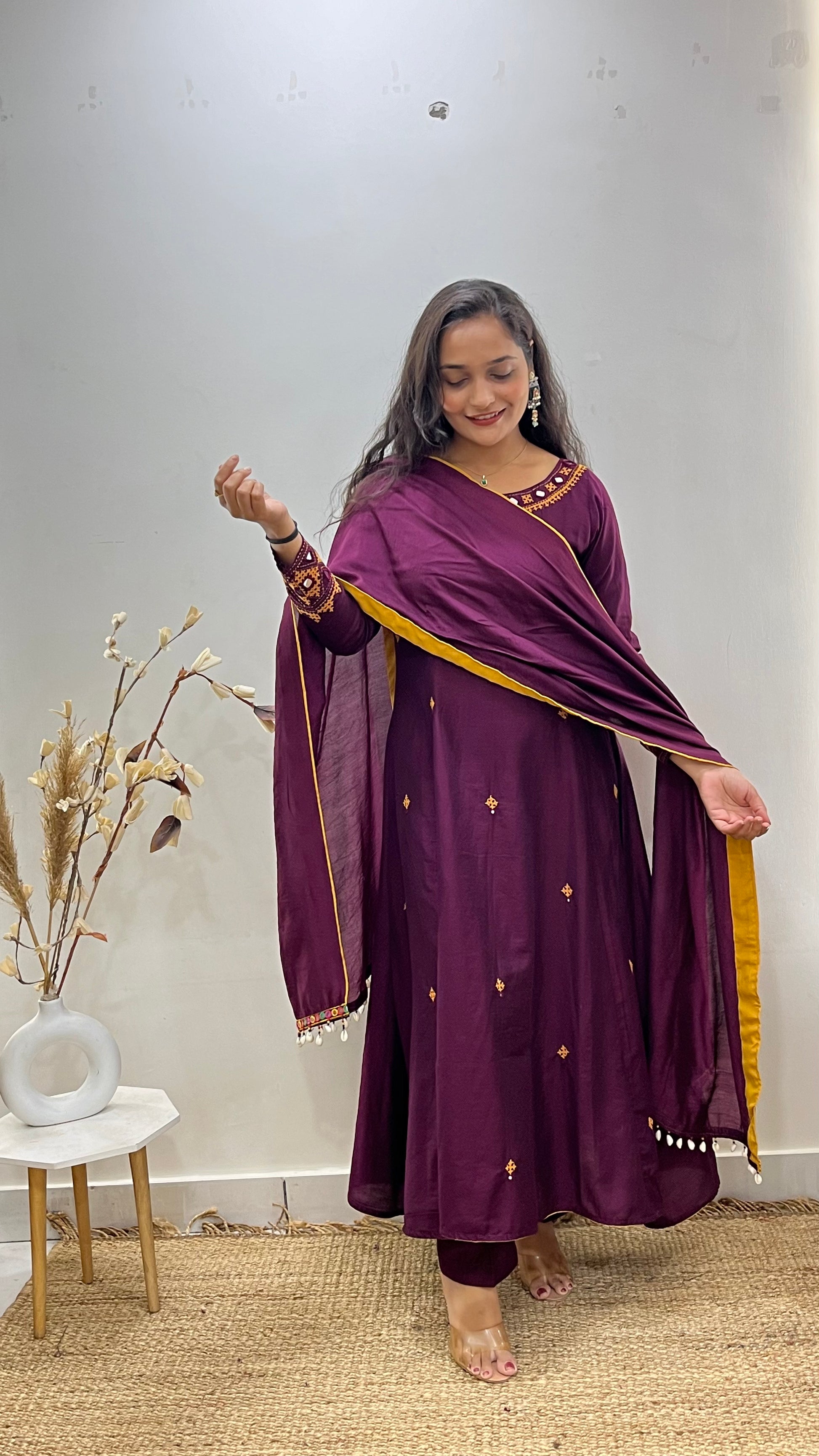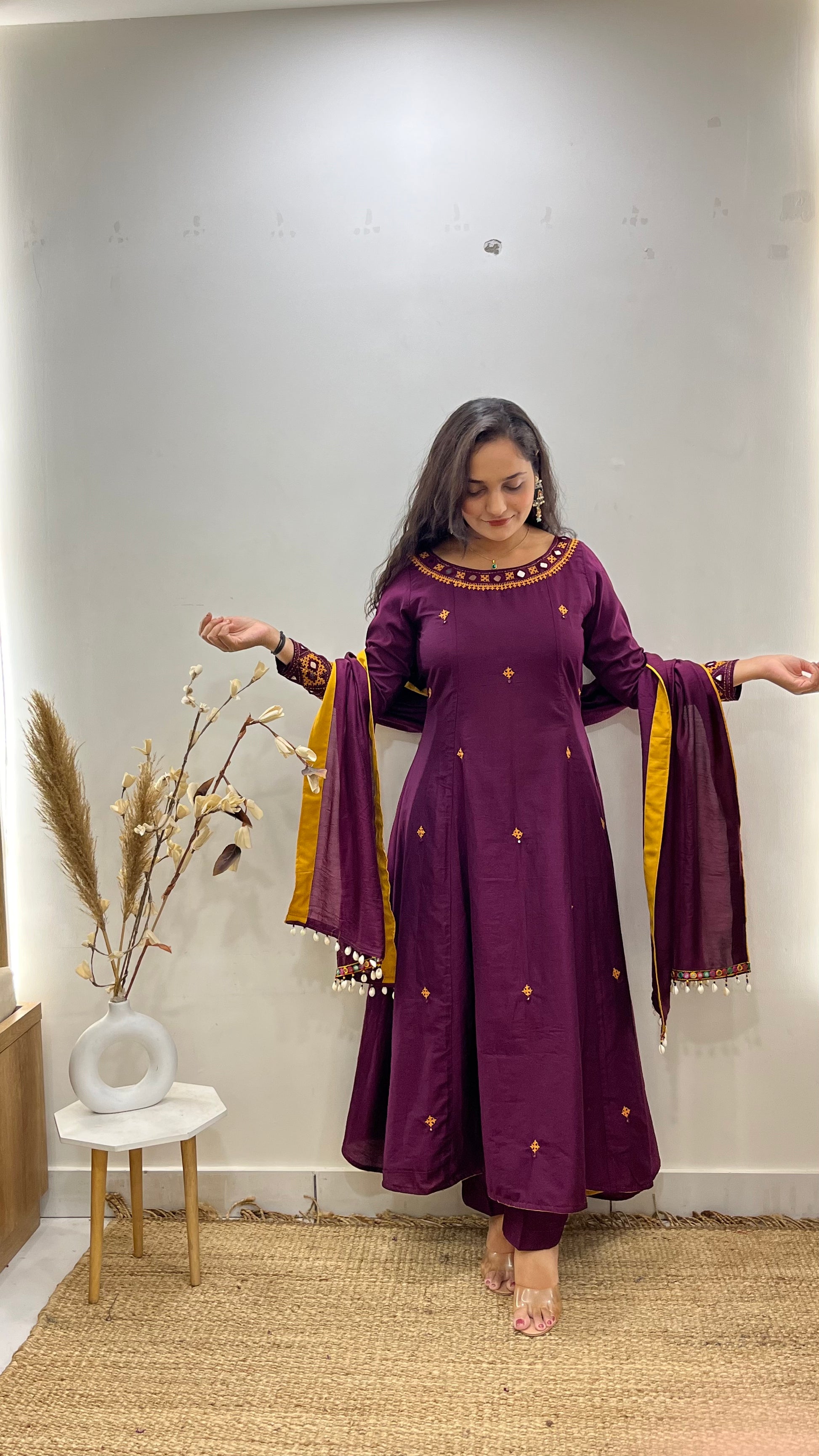Elegant Gamthi Work Anarkali with real mirror and thread embroidery on the sleeves and neckline, complemented by all-over buttis. Paired with a chanderi dupatta finished with delicate tassel details. A modestly flared anarkali in a striking color combination — ideal for festive wear and bridal trousseau. ✨