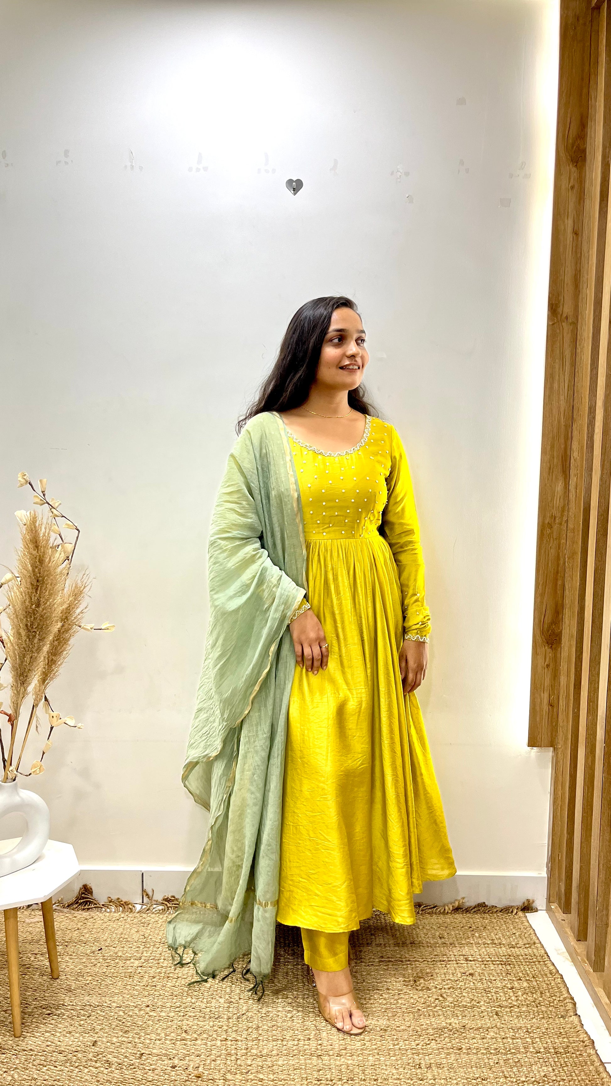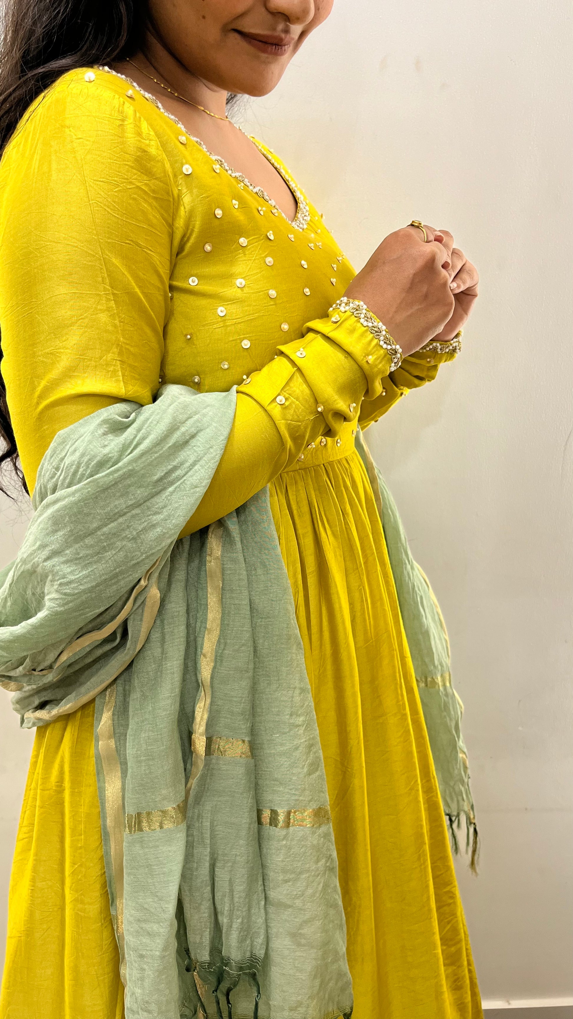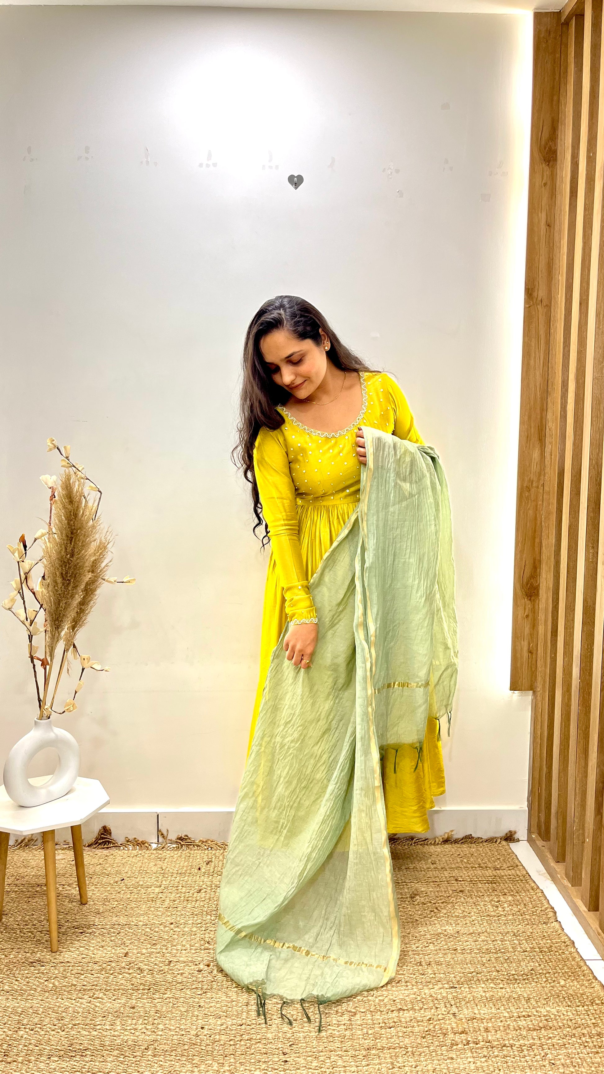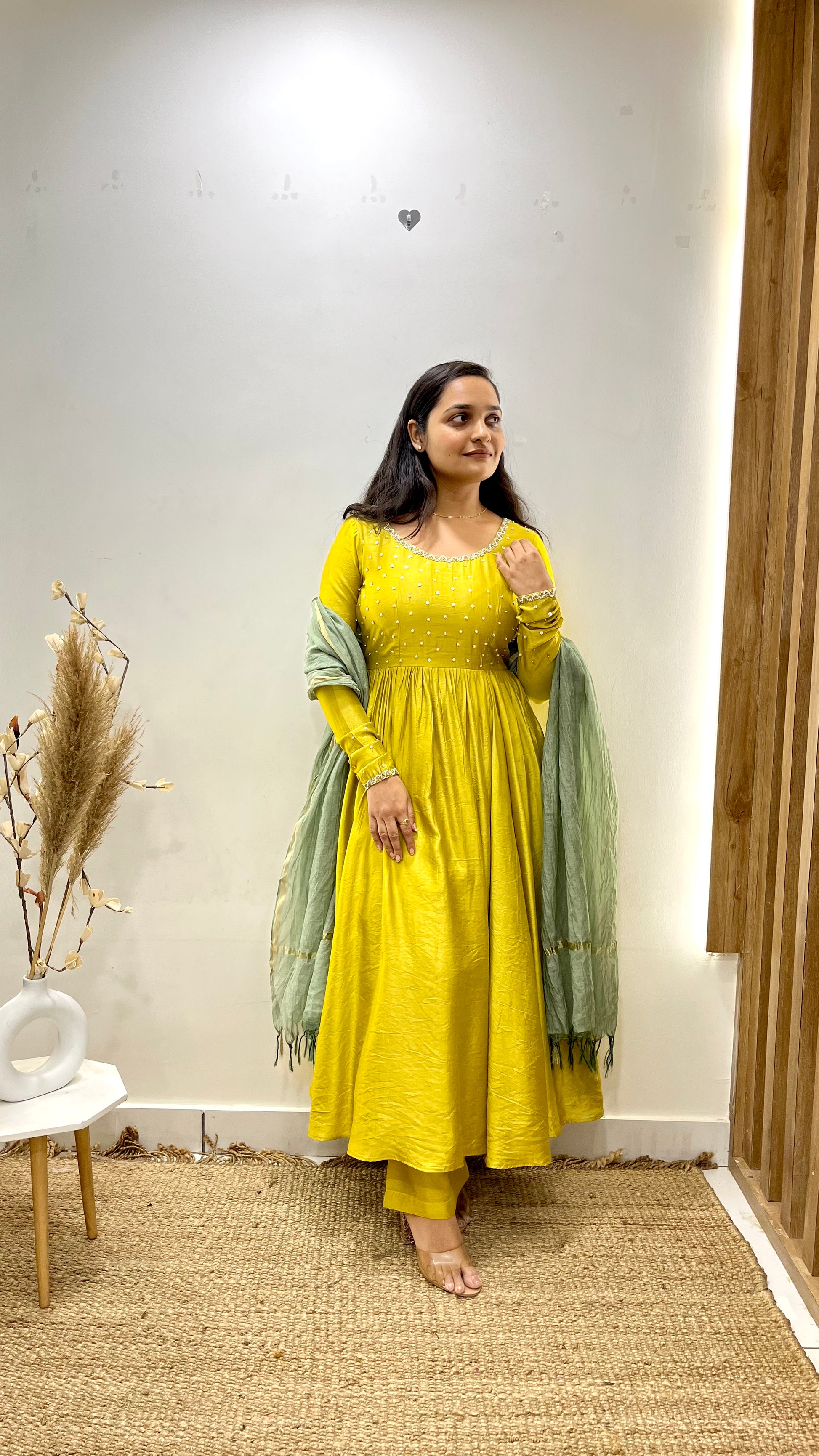 Mehendi green Anarkali, crafted from luxurious Chanderi fabric. The voluminous flare adds a regal charm, while the delicate pearl and sequin work on the yoke and sleeves exude elegance. Designed with classic churidar sleeves and paired with a Banarasi Chanderi dupatta and matching pants, it’s a perfect choice for festive occasions.
