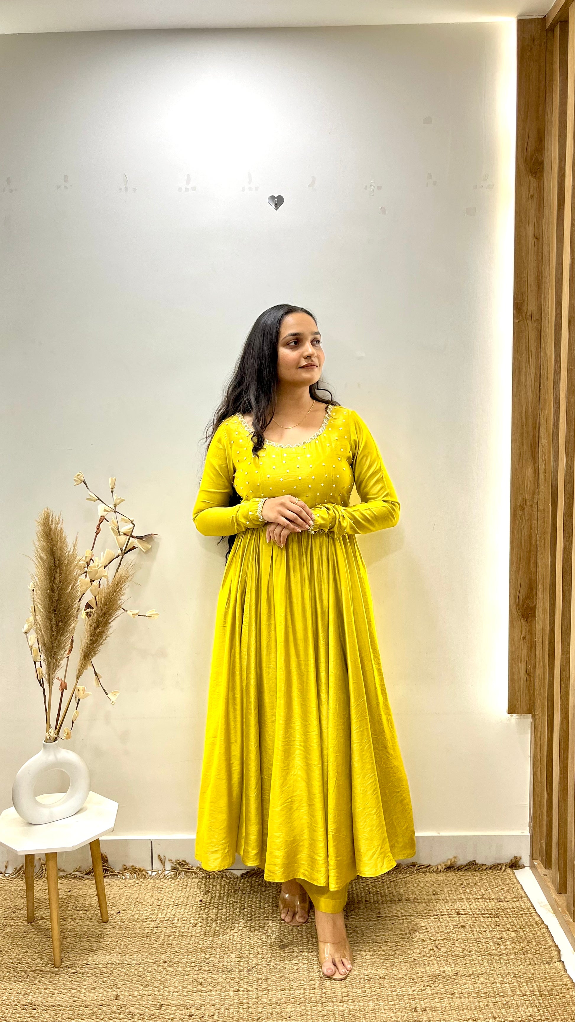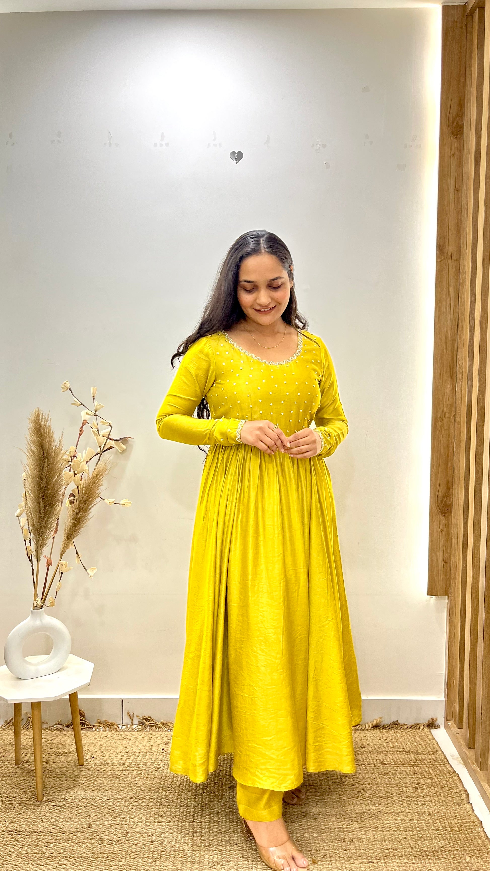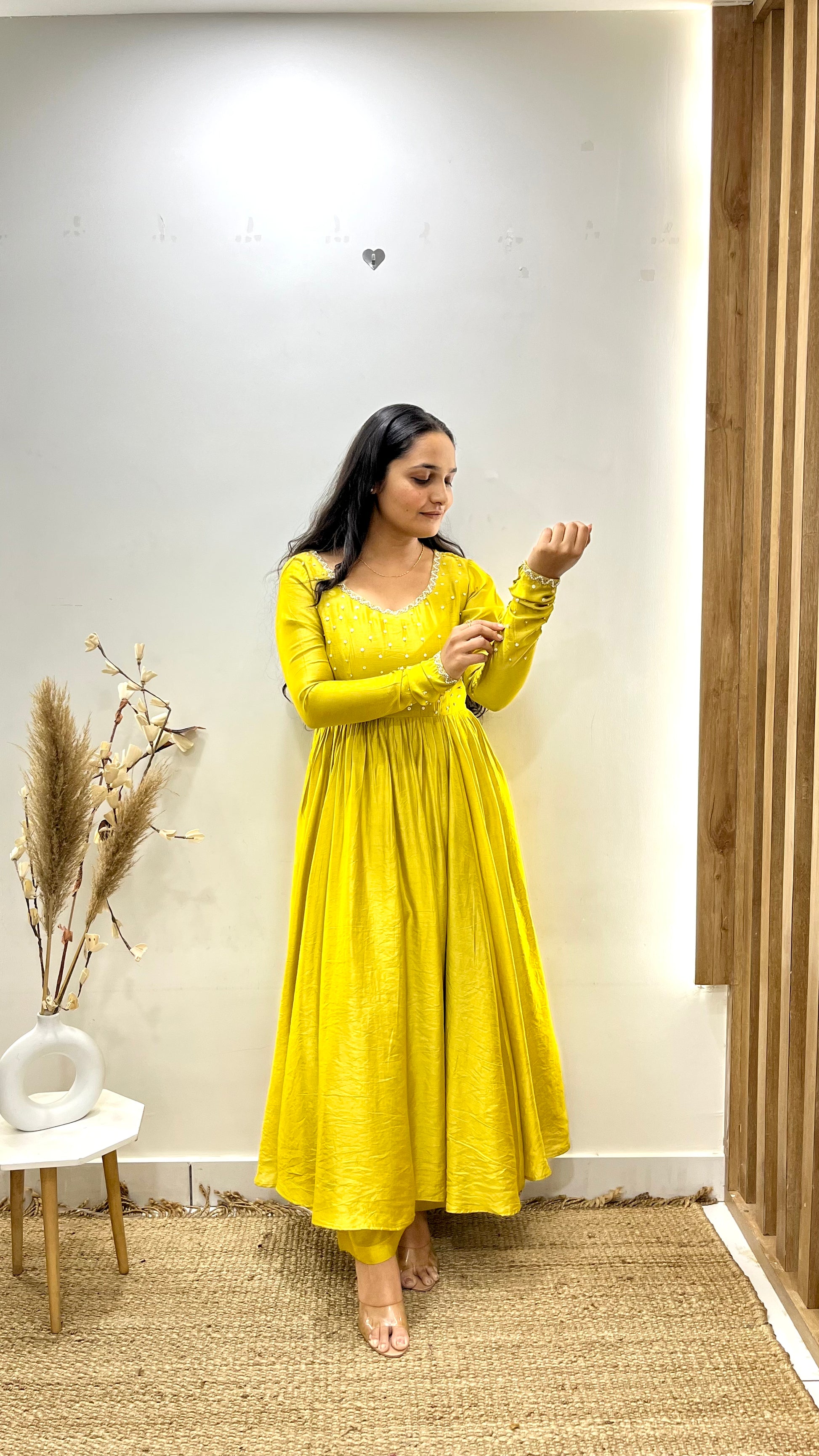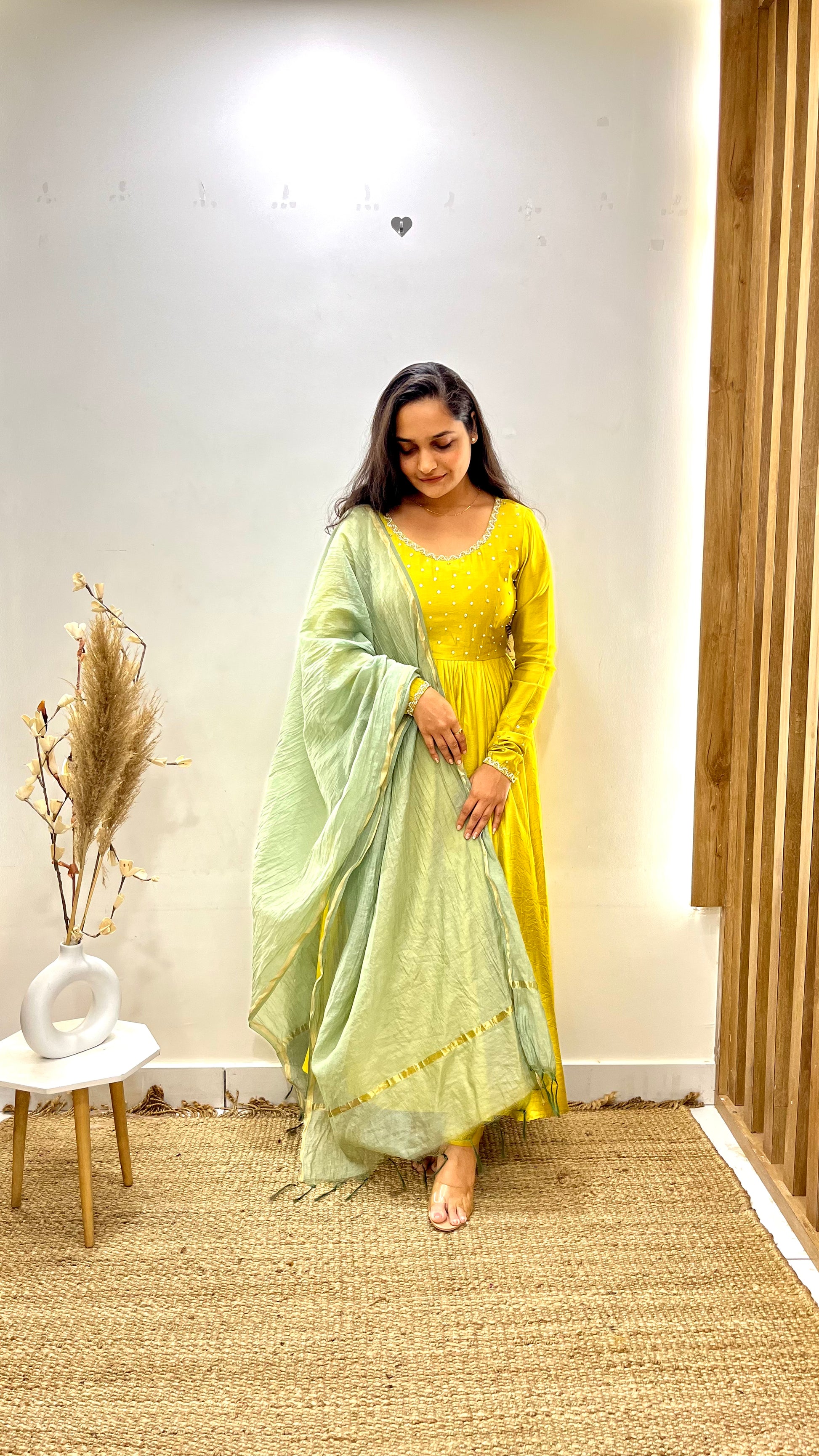 Mehendi green Anarkali, crafted from luxurious Chanderi fabric. The voluminous flare adds a regal charm, while the delicate pearl and sequin work on the yoke and sleeves exude elegance. Designed with classic churidar sleeves and paired with a Banarasi Chanderi dupatta and matching pants, it’s a perfect choice for festive occasions.