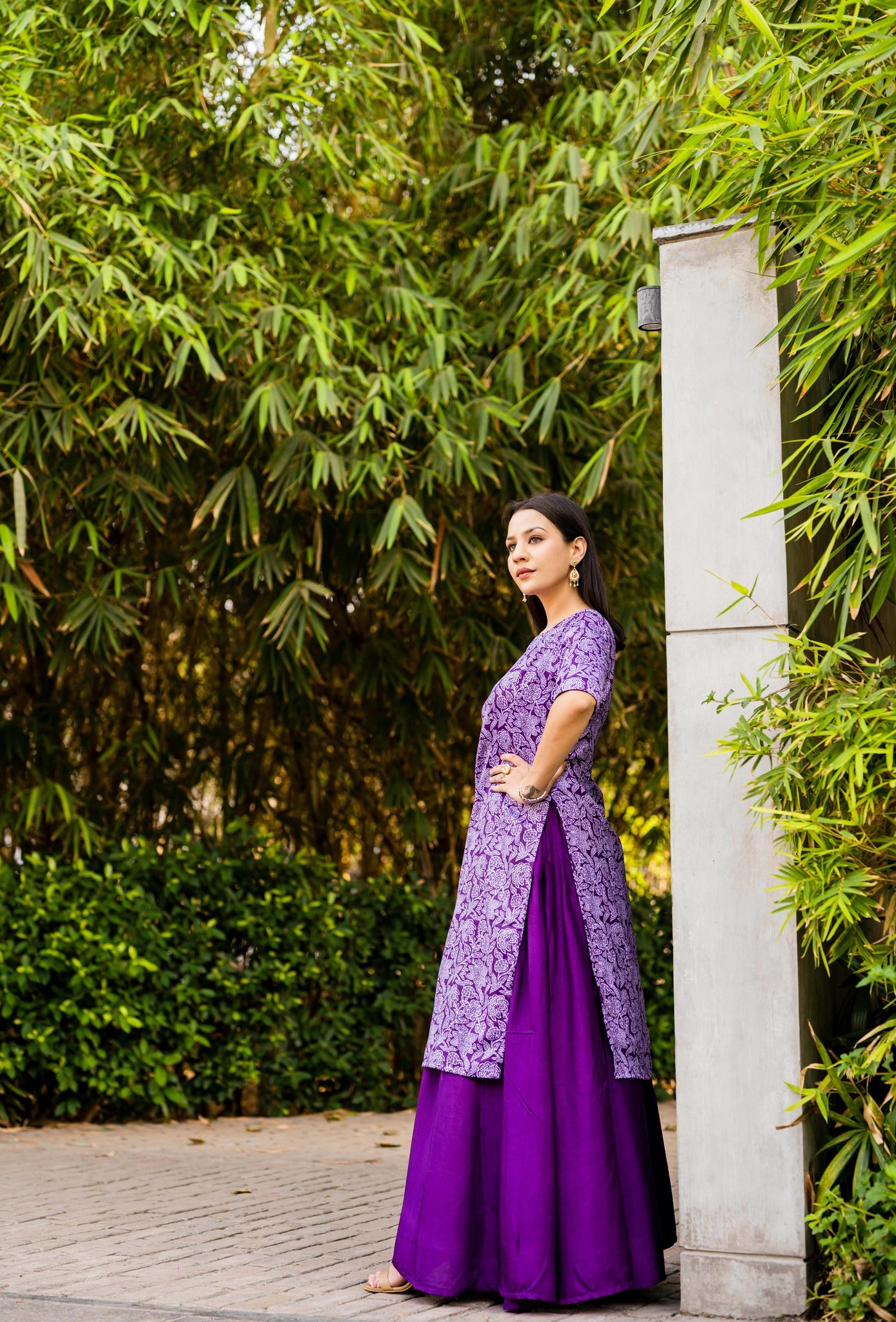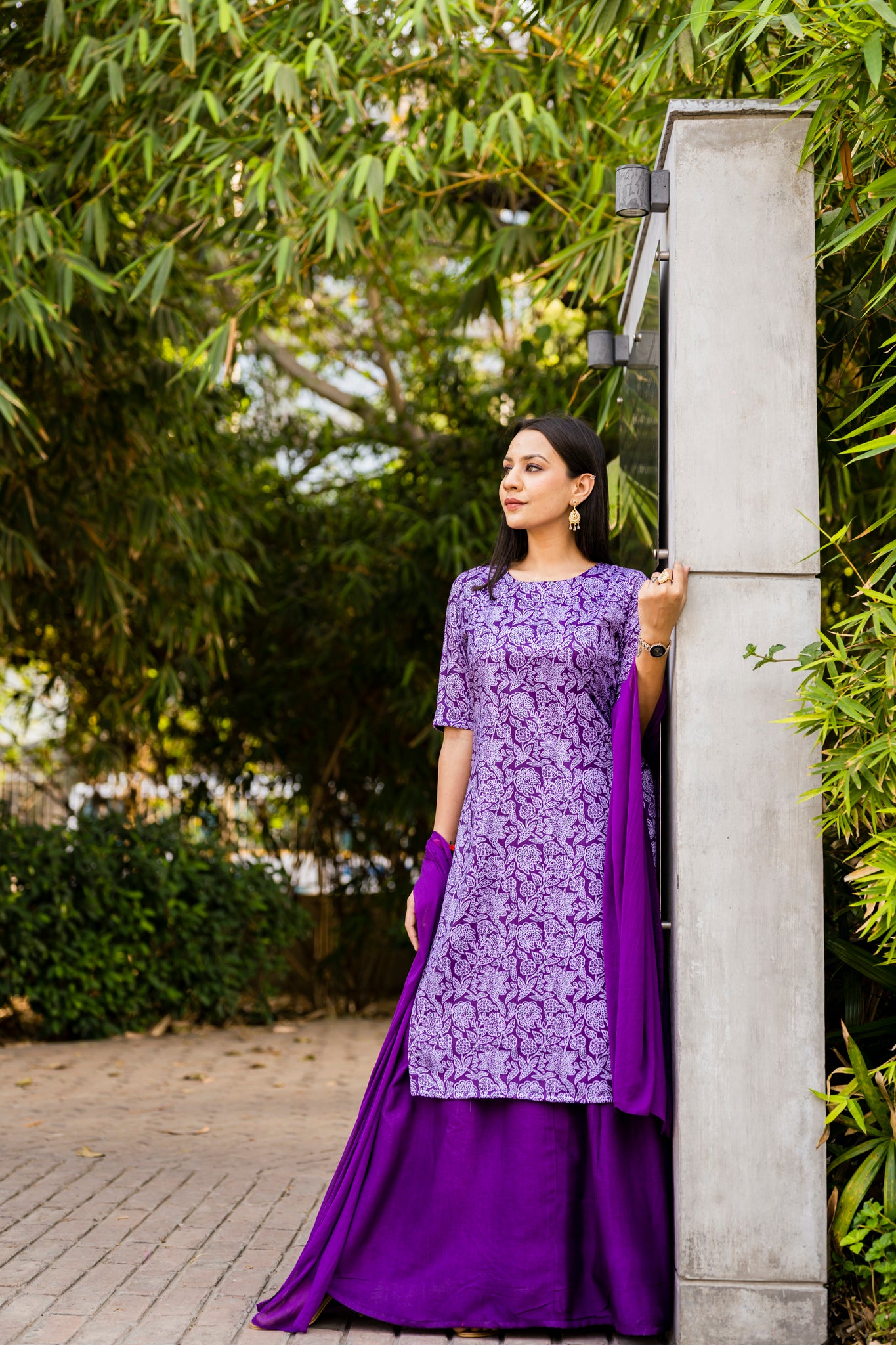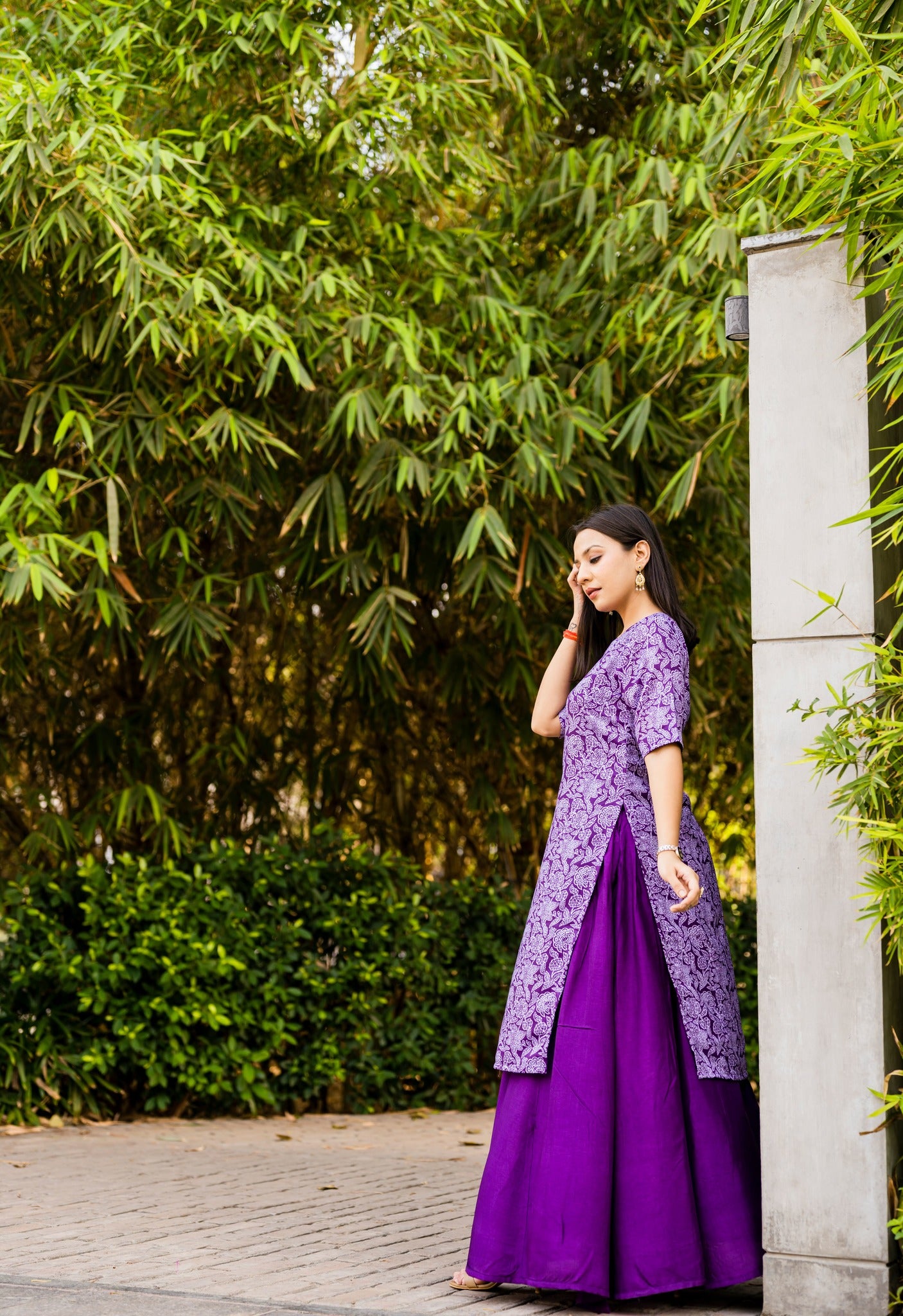 Make heads turn with this Purple Kurta and Skirt Set. The kurta is crafted in lush satin fabric which gives this outfit a luxury feel. Paired with a flared and flowy skirt in cotton silk, this outfit is perfect for any small gathering or event.