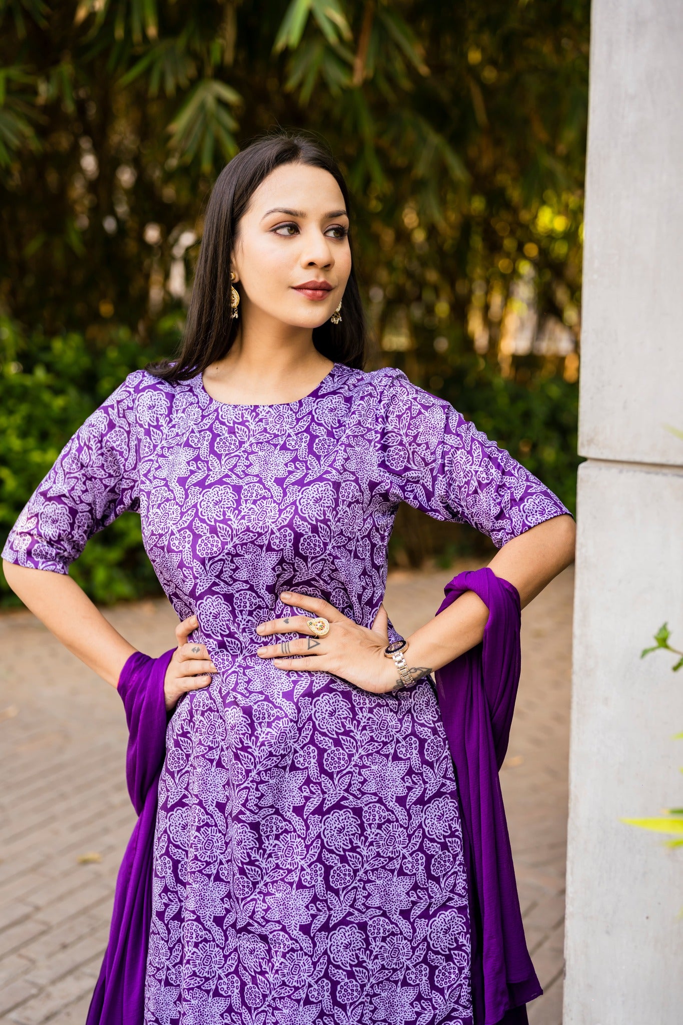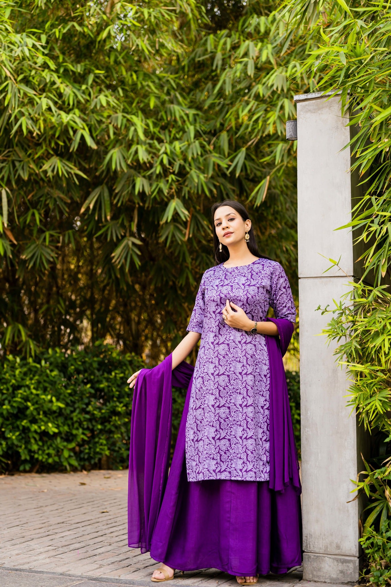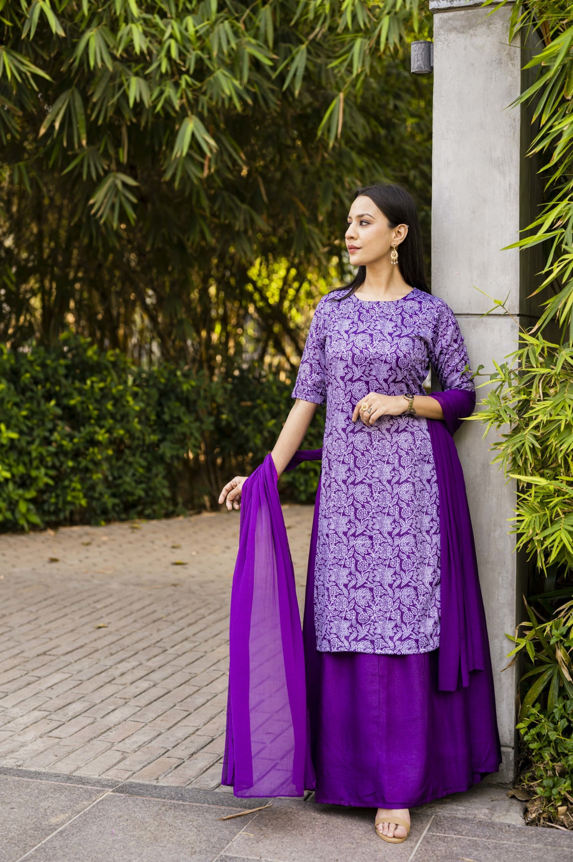 Make heads turn with this Purple Kurta and Skirt Set. The kurta is crafted in lush satin fabric which gives this outfit a luxury feel. Paired with a flared and flowy skirt in cotton silk, this outfit is perfect for any small gathering or event.