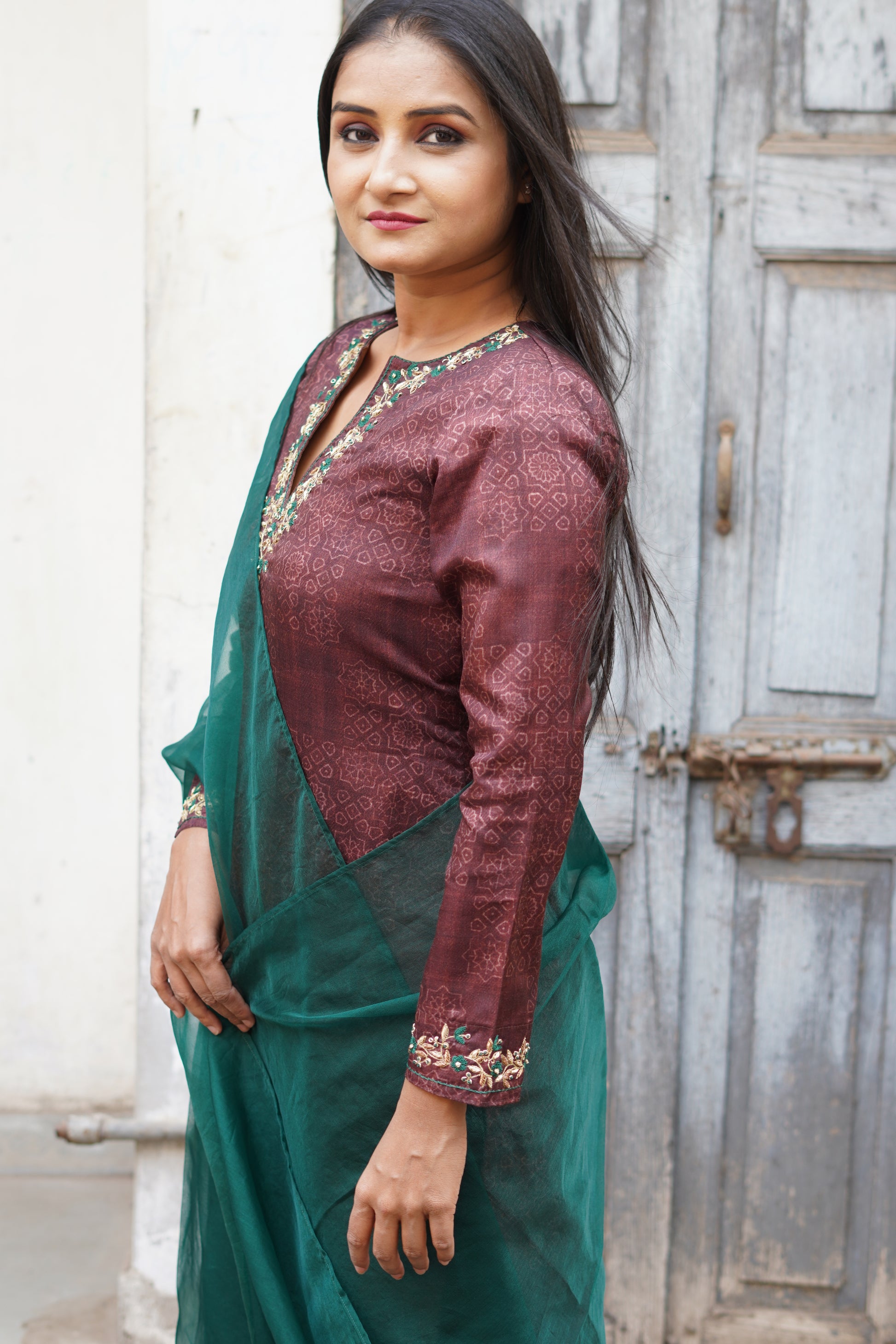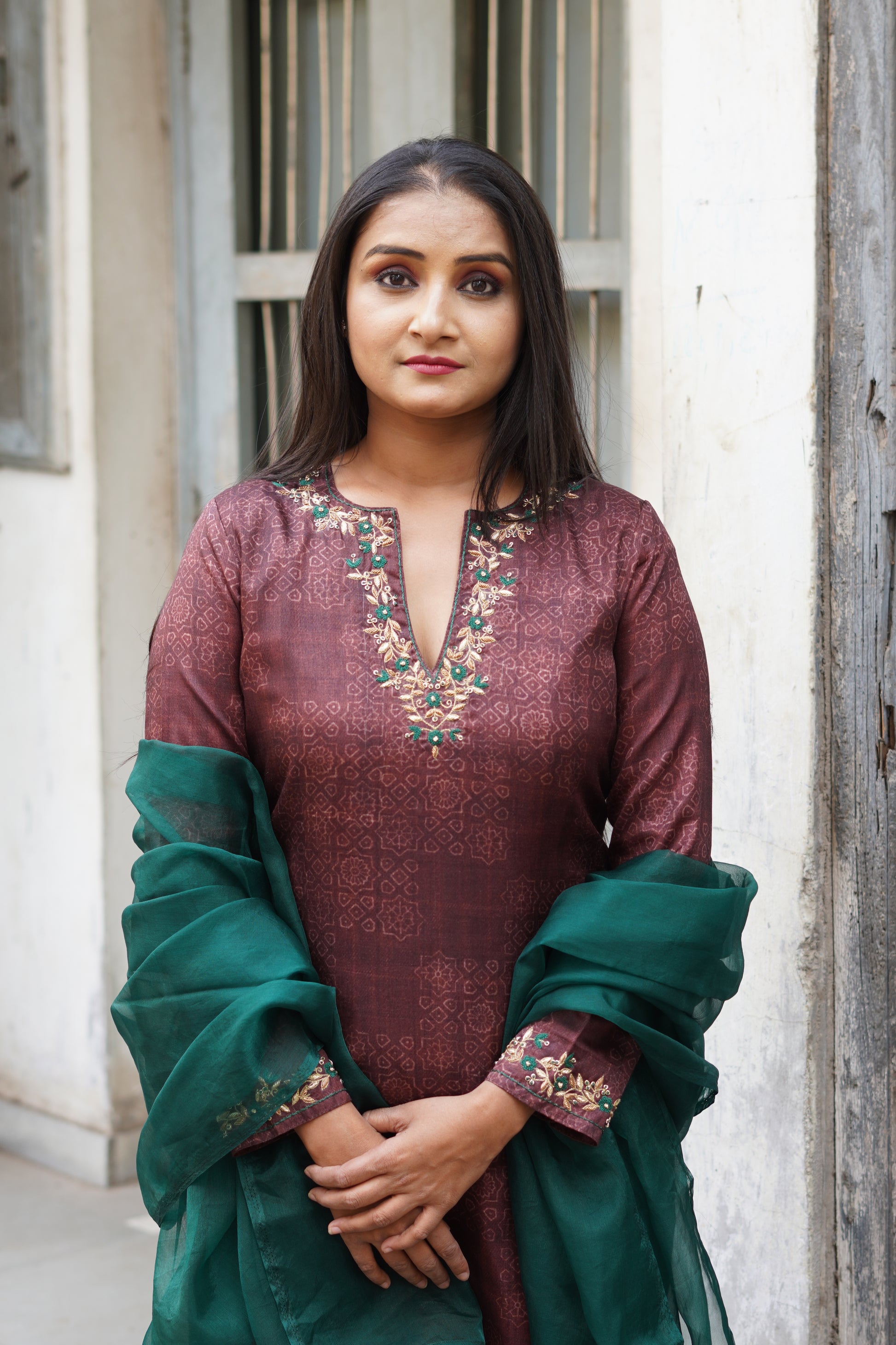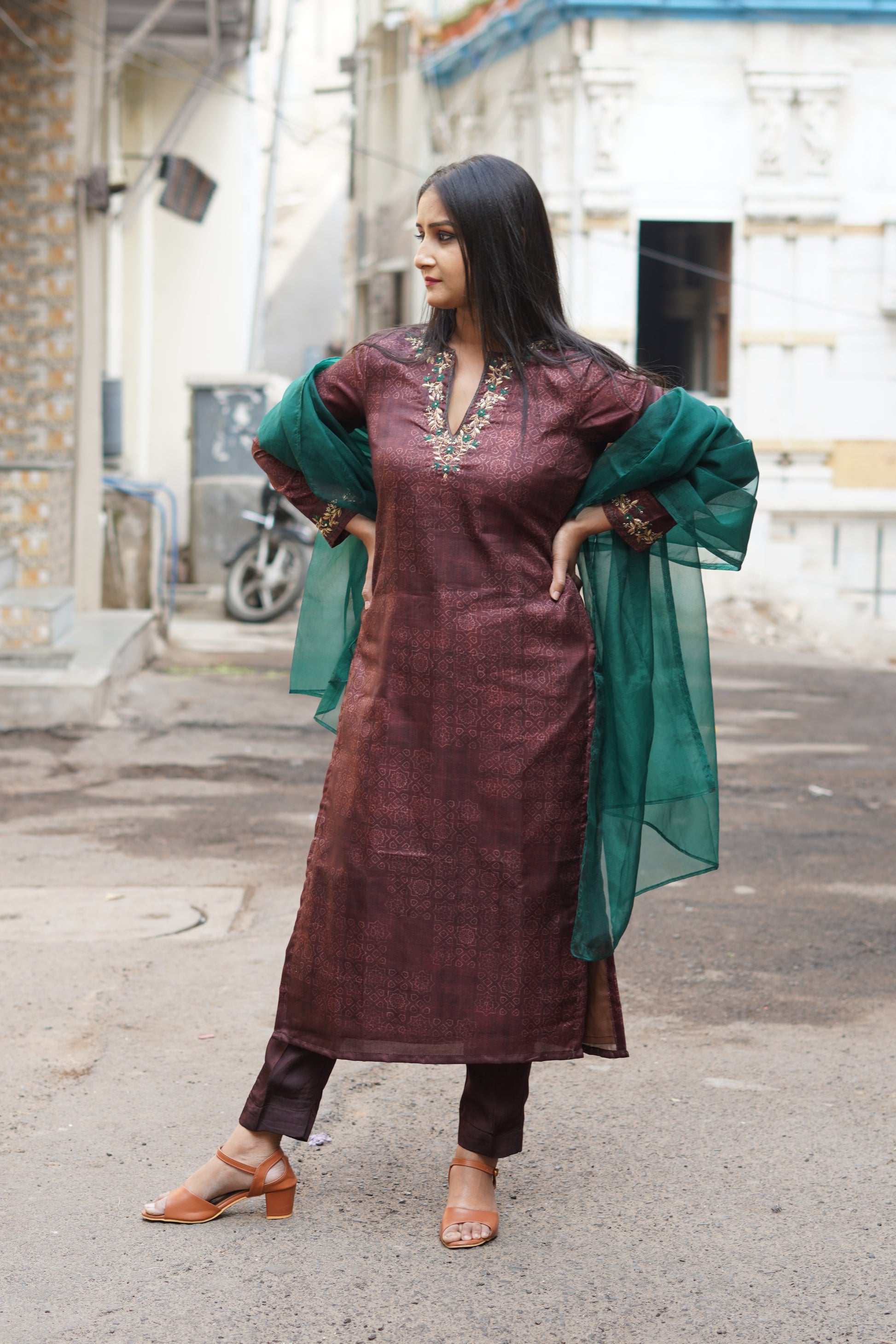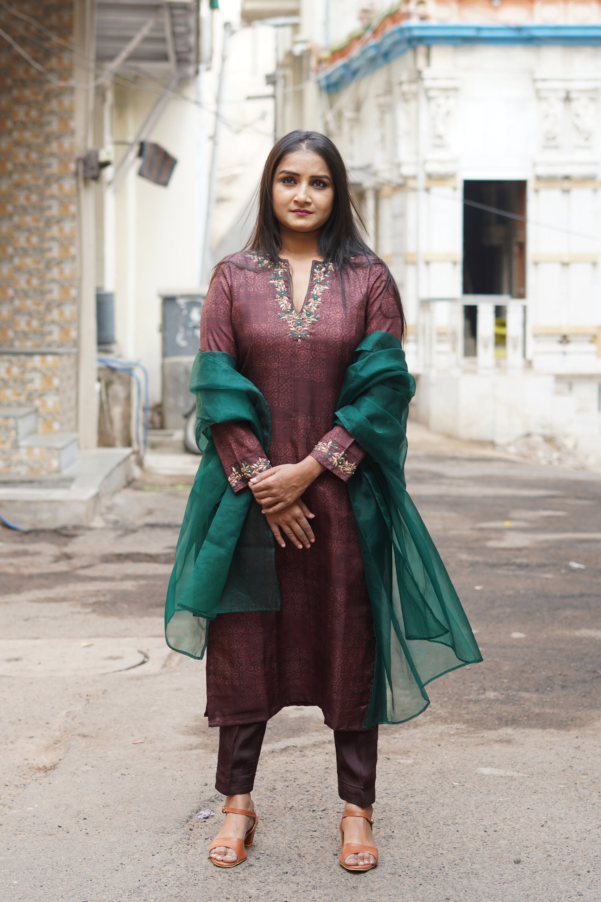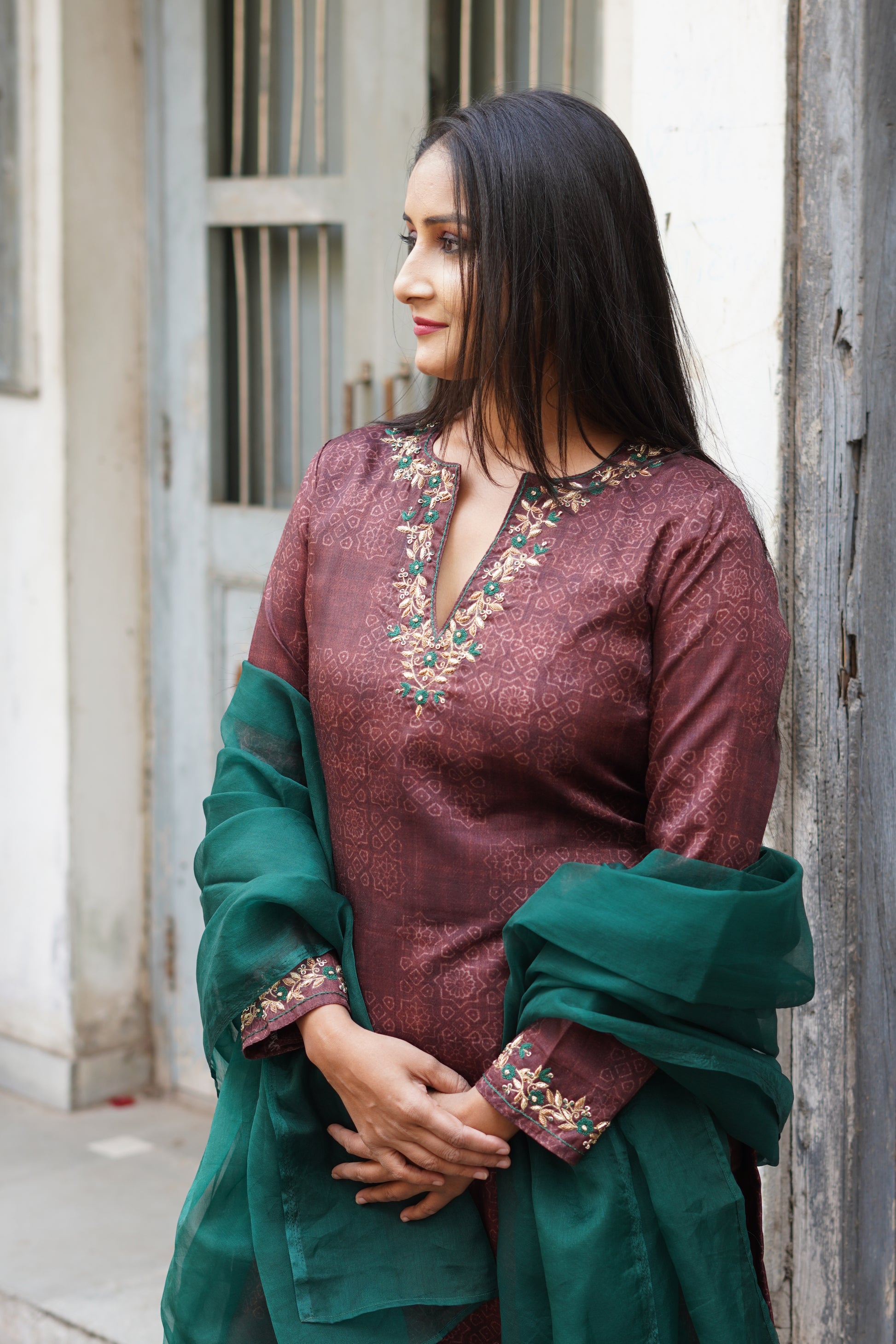 Our vintage and hand embroidered three piece suit set in Kashmiri linen is sure to bring out the elegance. Hand embroidered across neck line and sleeves. Paired with a contrast organza dupatta and pants.