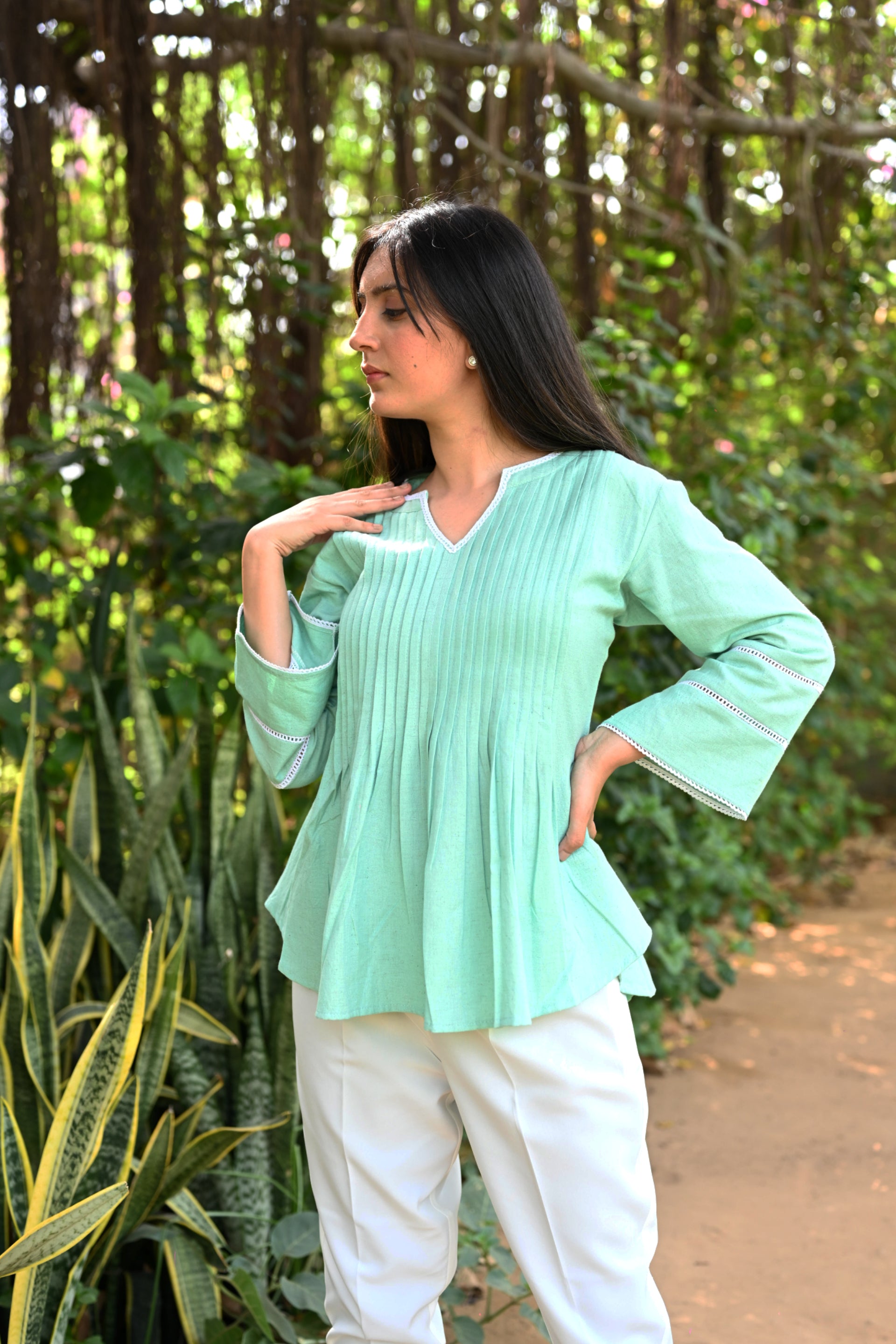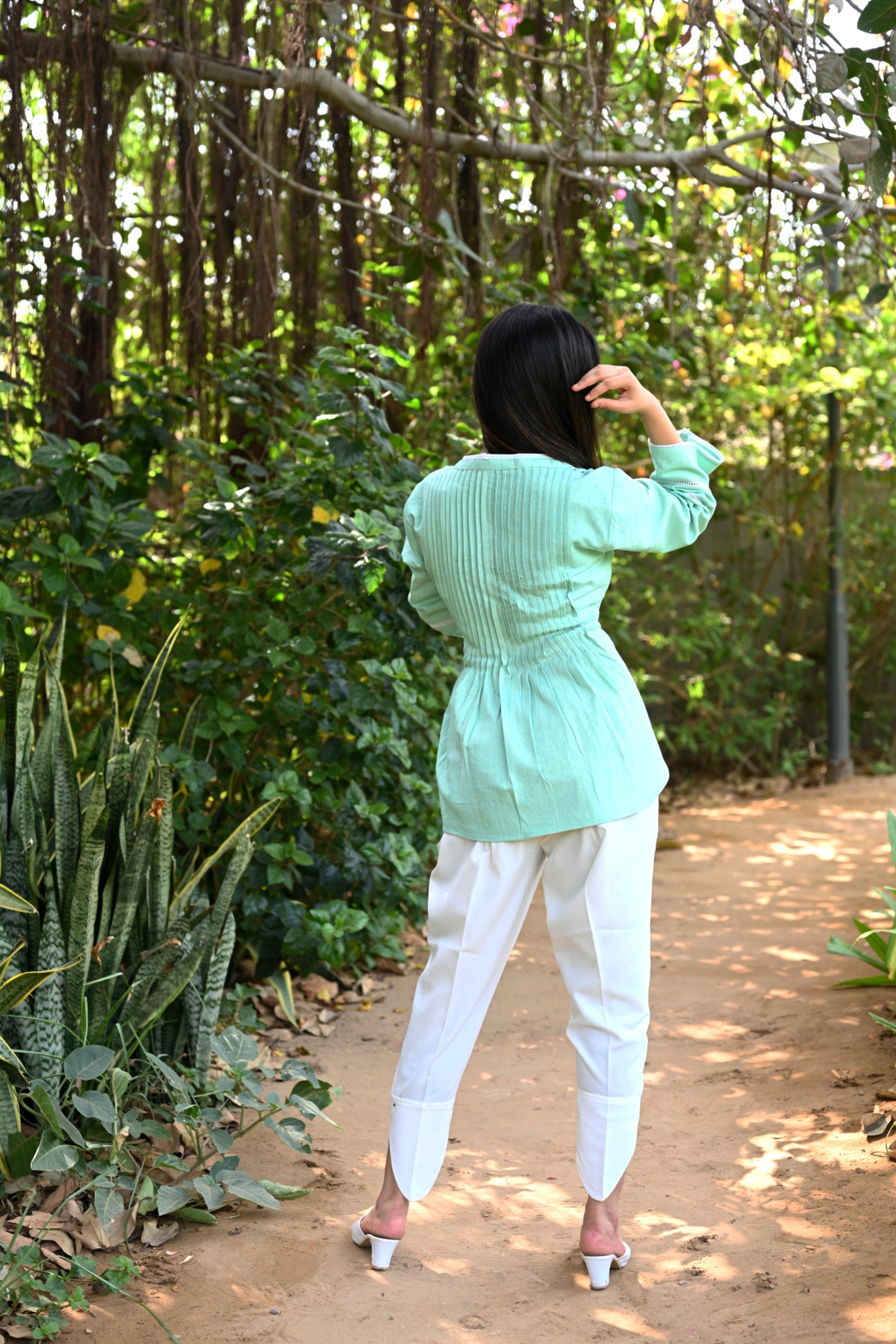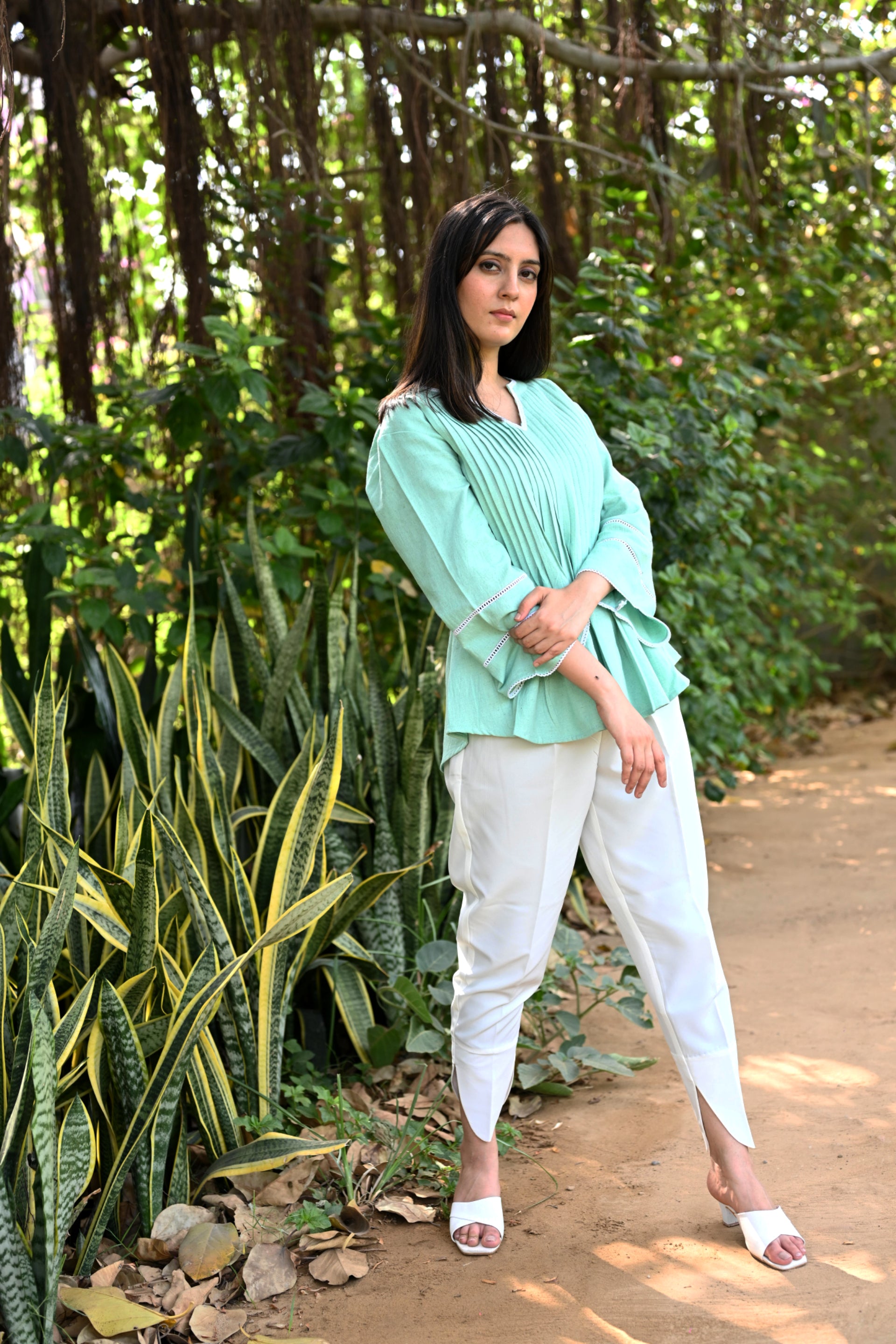 Be ready to steal the lime light in our Mint Green Co-ord Set. The pleated detailing on front and back adds to the charm of this look. The white crepe pants crafted in unique cuts at the hem is going to be a show stopper.