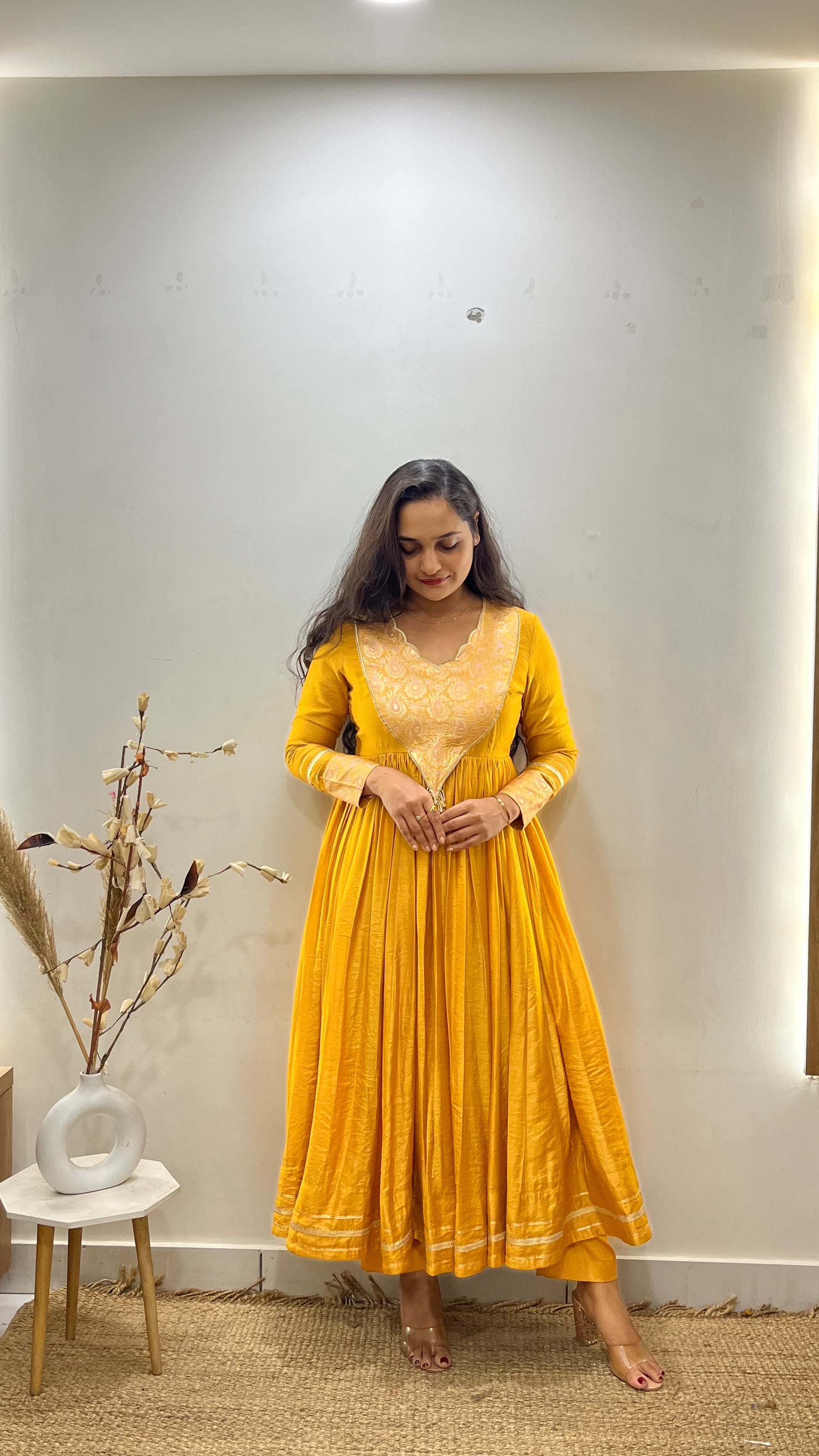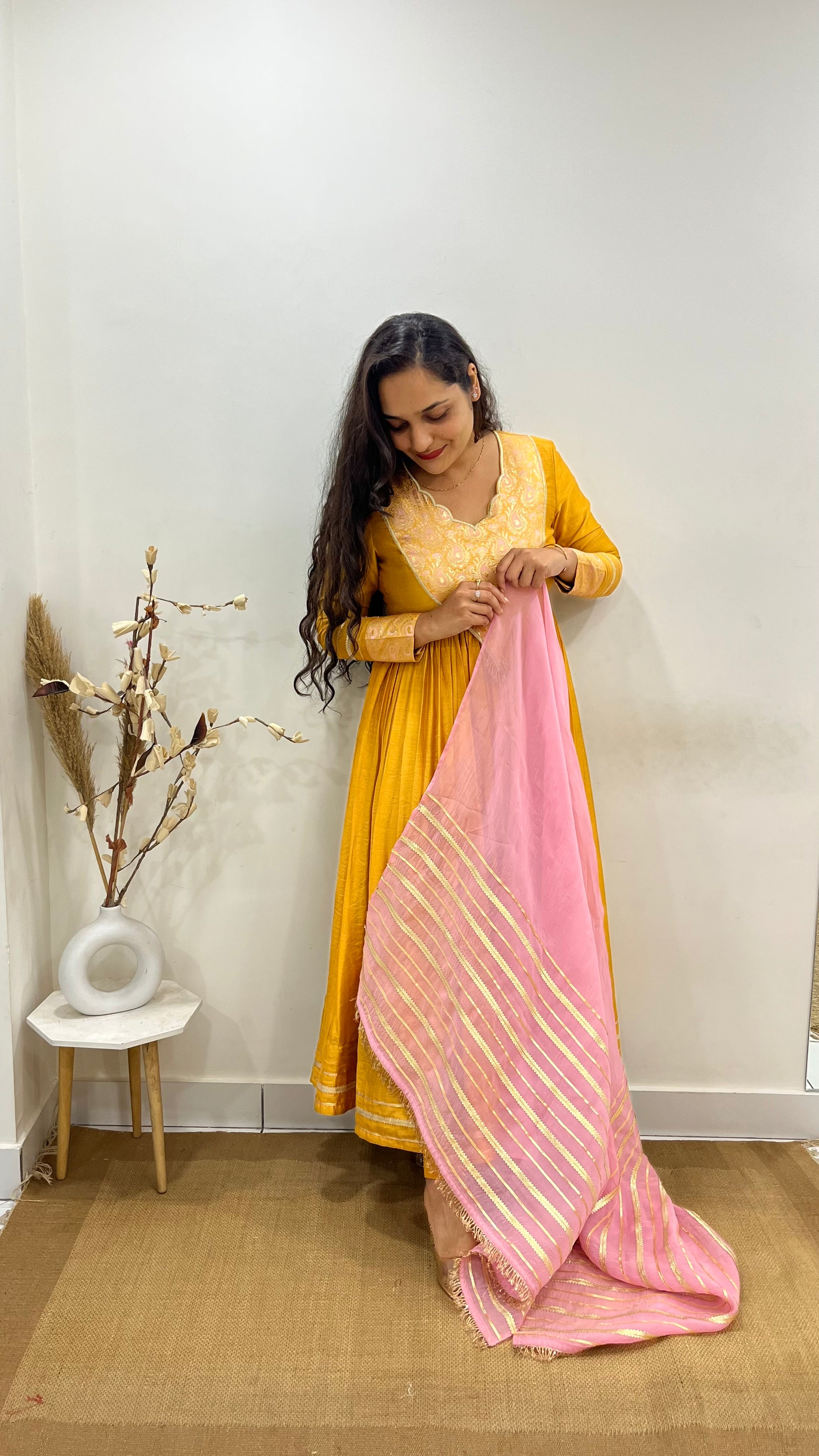 Crafted in elegant Chanderi, this flared mustard yellow Anarkali is paired with a soft pastel pink organza dupatta for a beautifully balanced look. Banarasi patch detailing on the yoke and sleeves adds a touch of heritage richness, while the one-of-a-kind neckline enhances its graceful appeal.