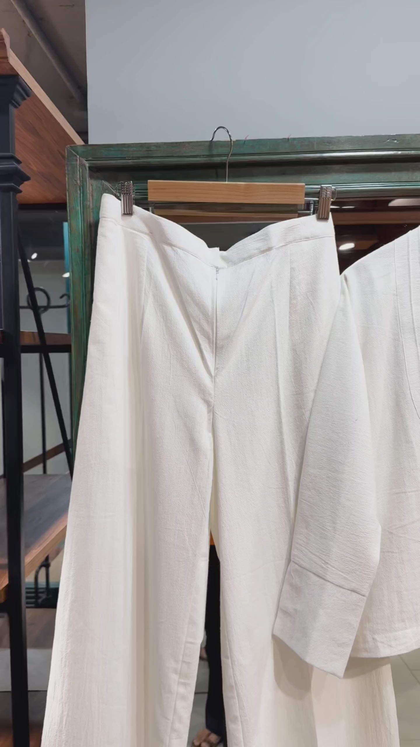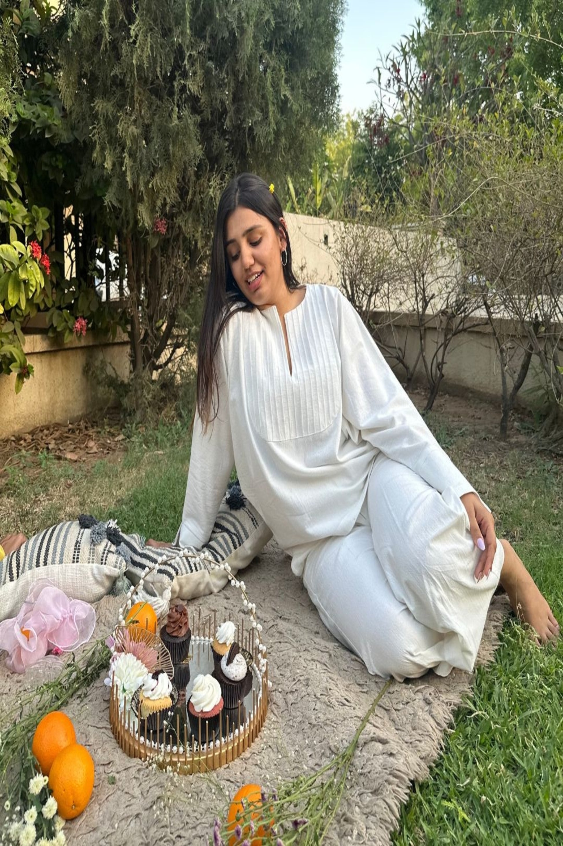 Nebula co-ord set, crafted from premium handloom cotton fabric for a chic ensemble that offers endless styling possibilities. The pintuck detailing on the top, paired with stylish culotte pants featuring convenient side pockets, creates an eye-catching visual delight.