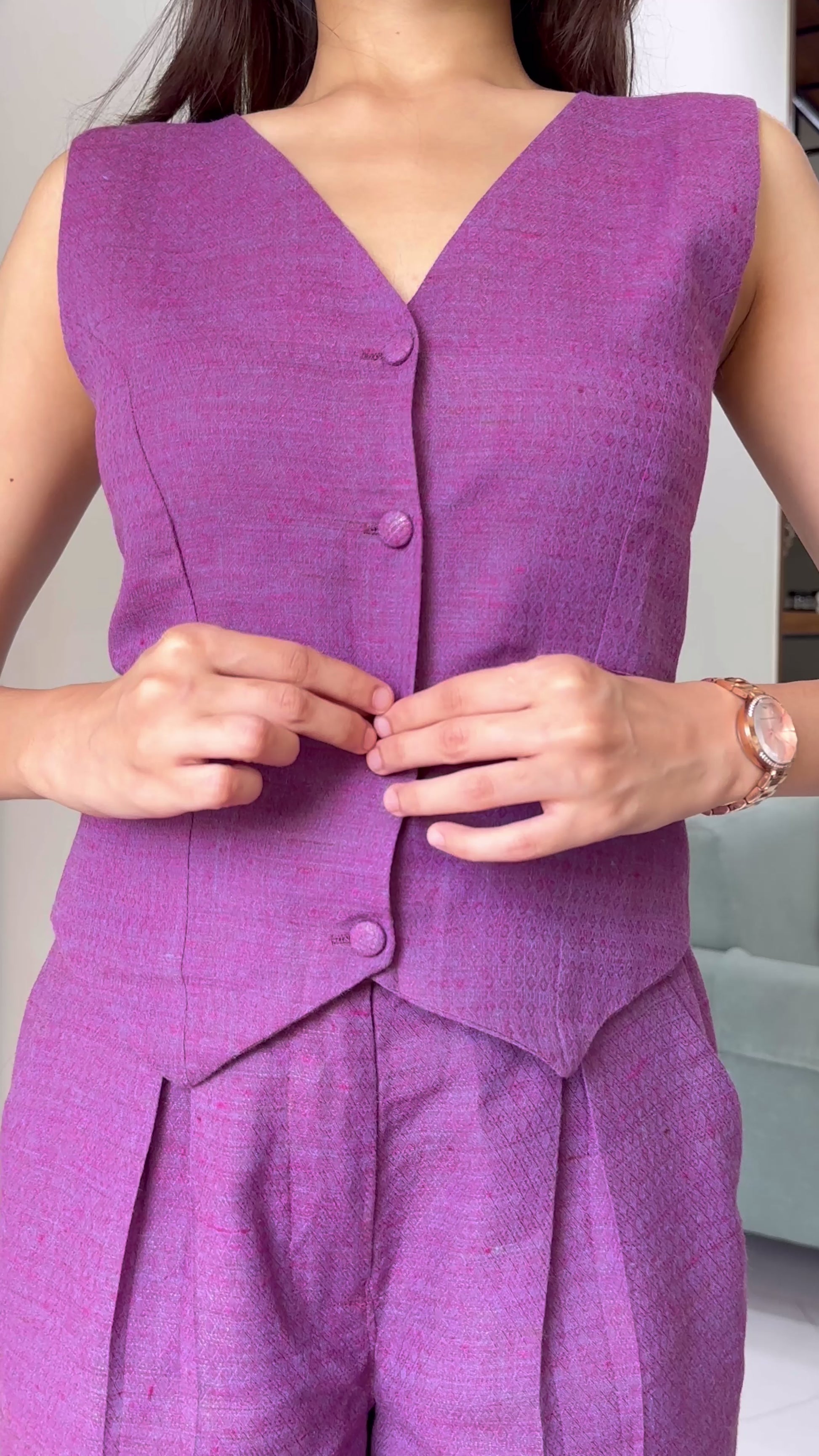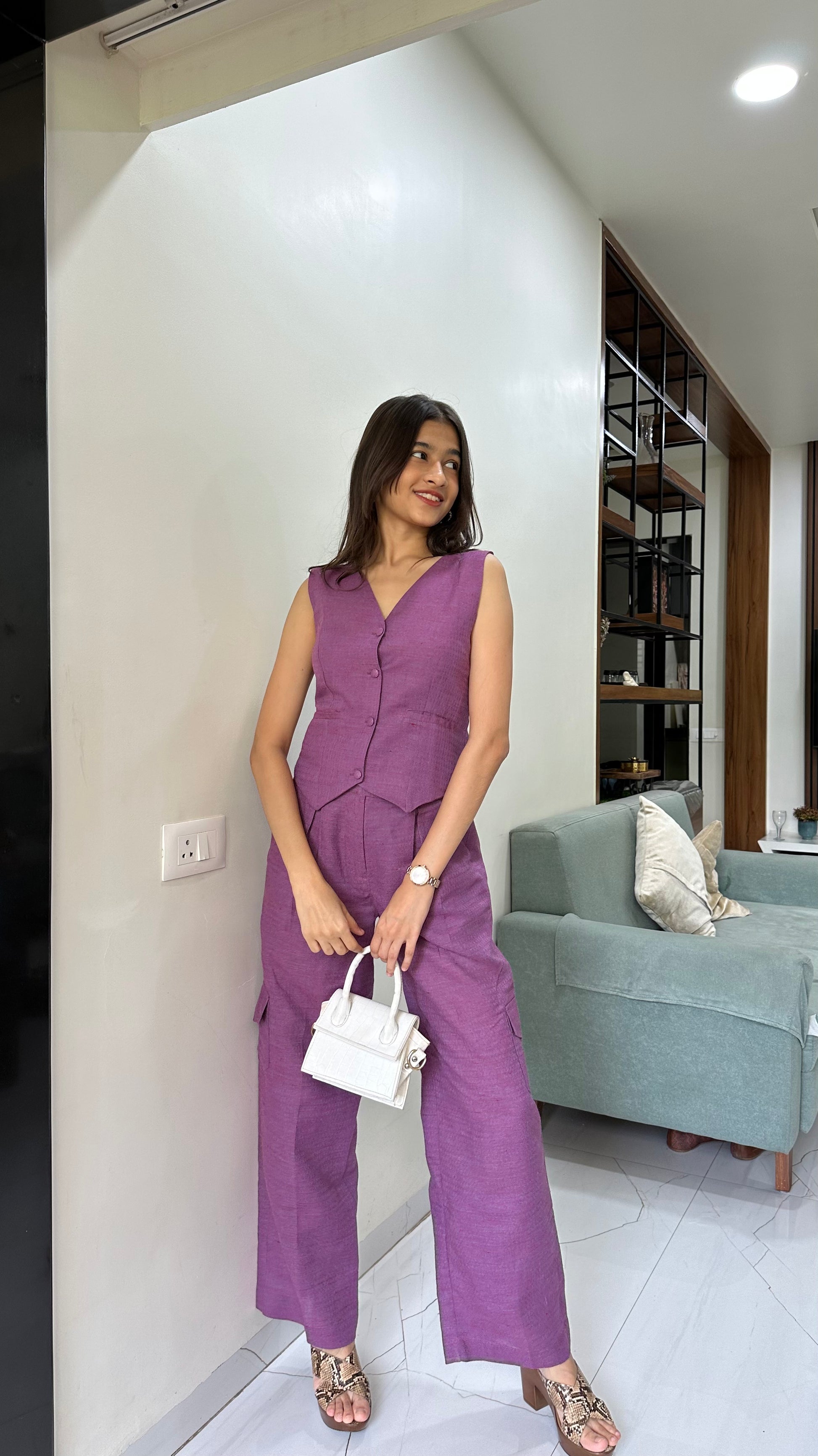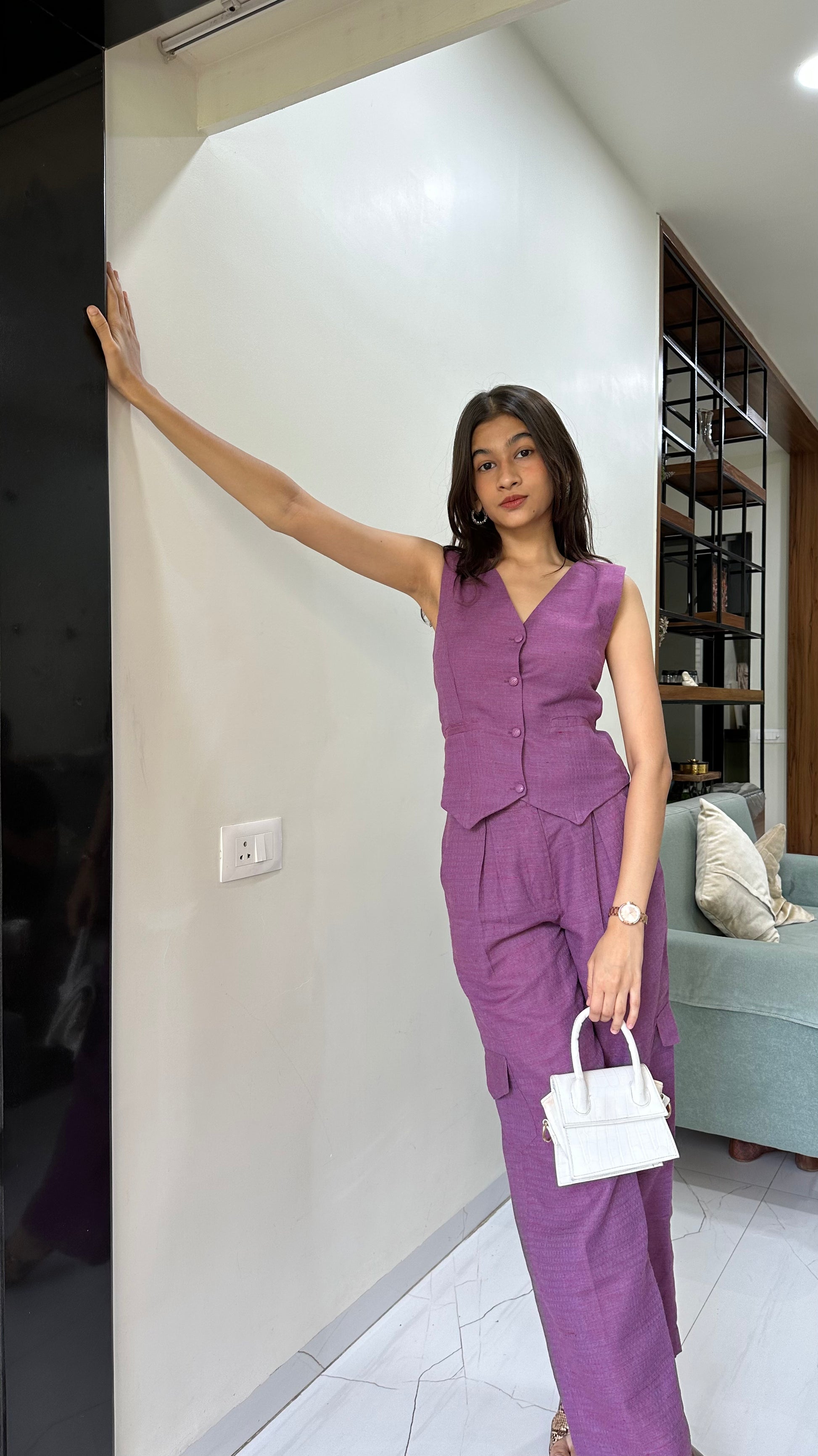 A fashionable yet comfortable outfit in self-weave cotton. The waistcoat paired with cargo pants. 4 pockets in cargo adds to its functionality. This set can be worn as is or can be styled with white shirt to create a chic look.