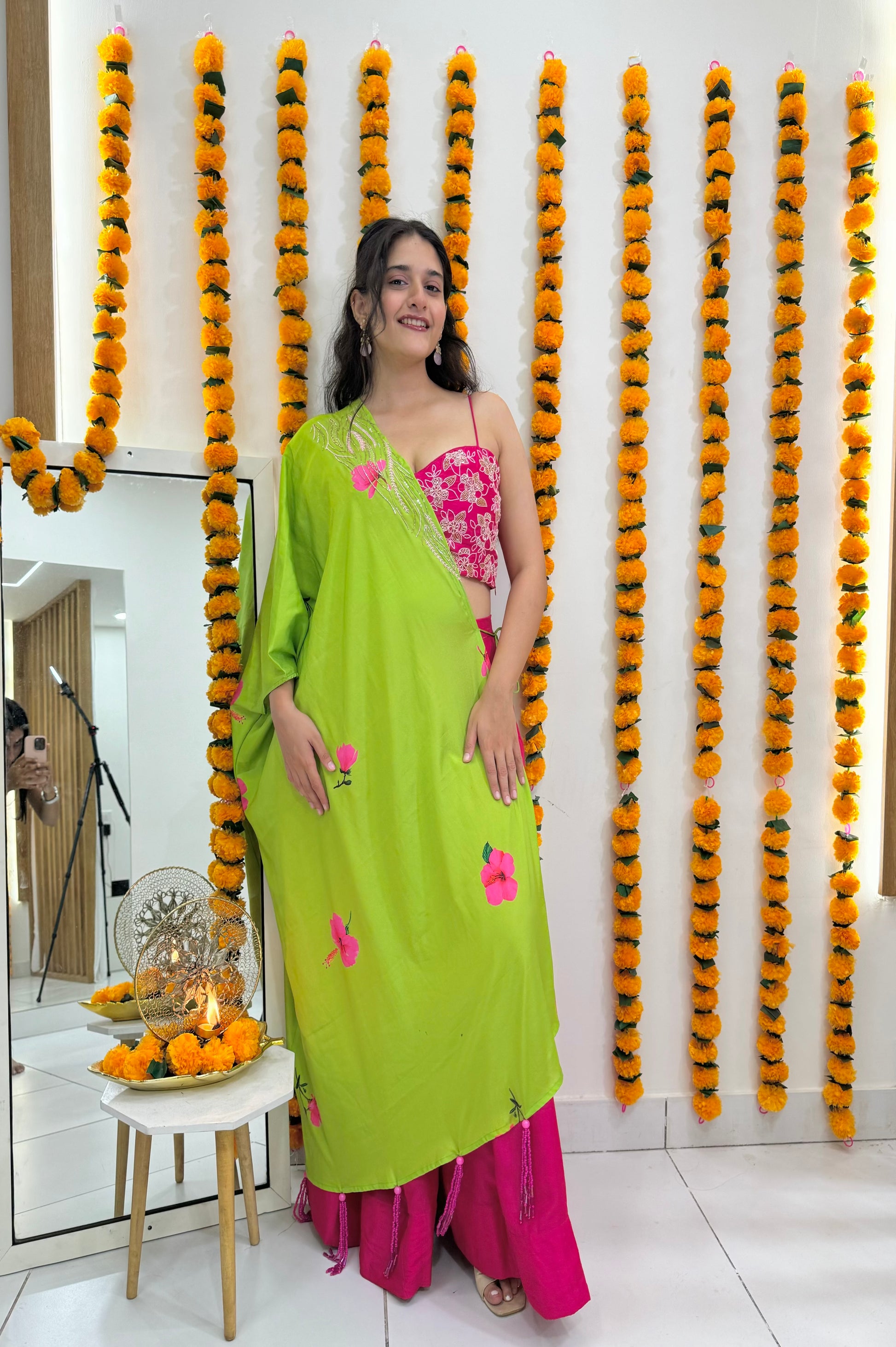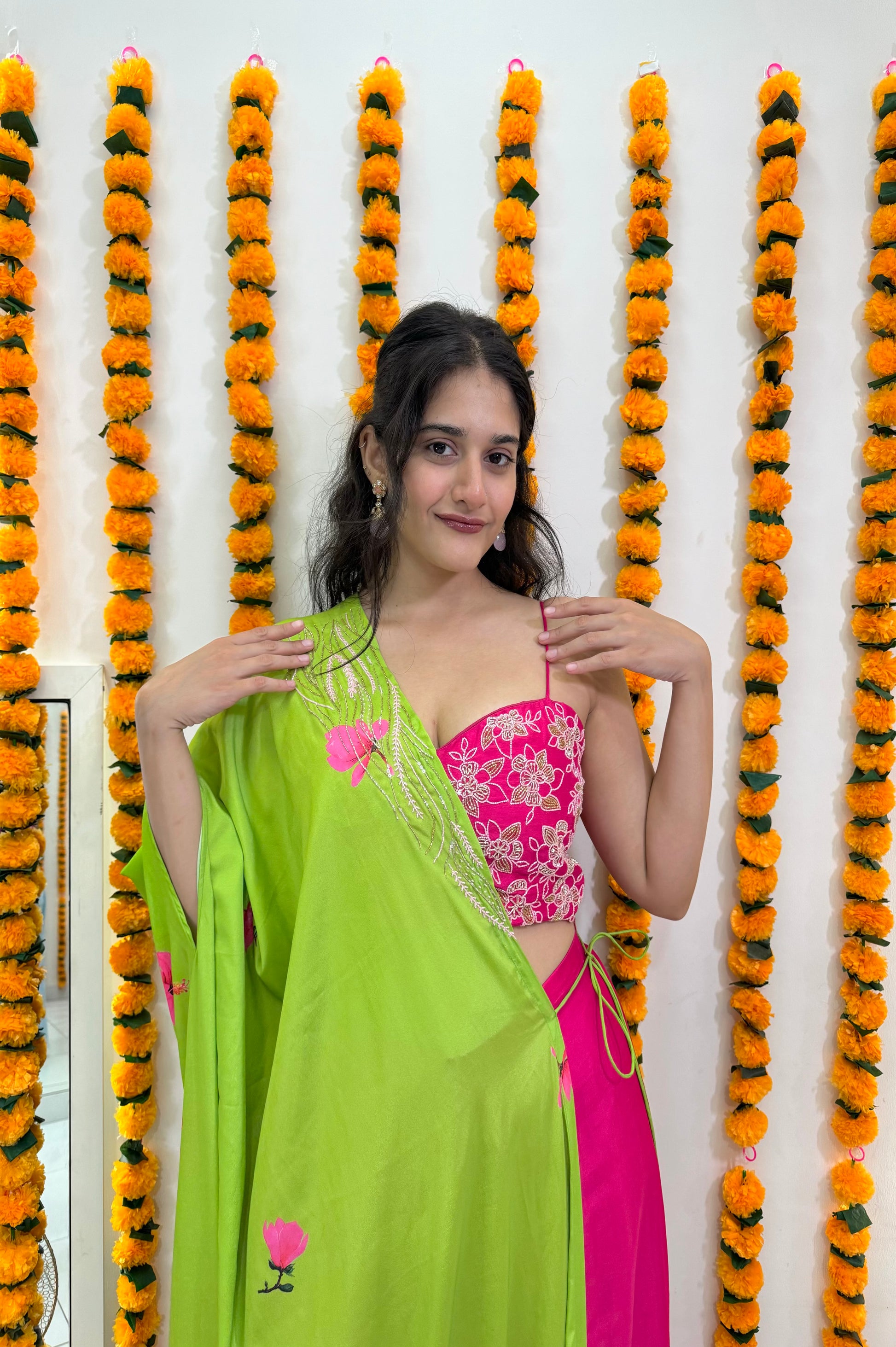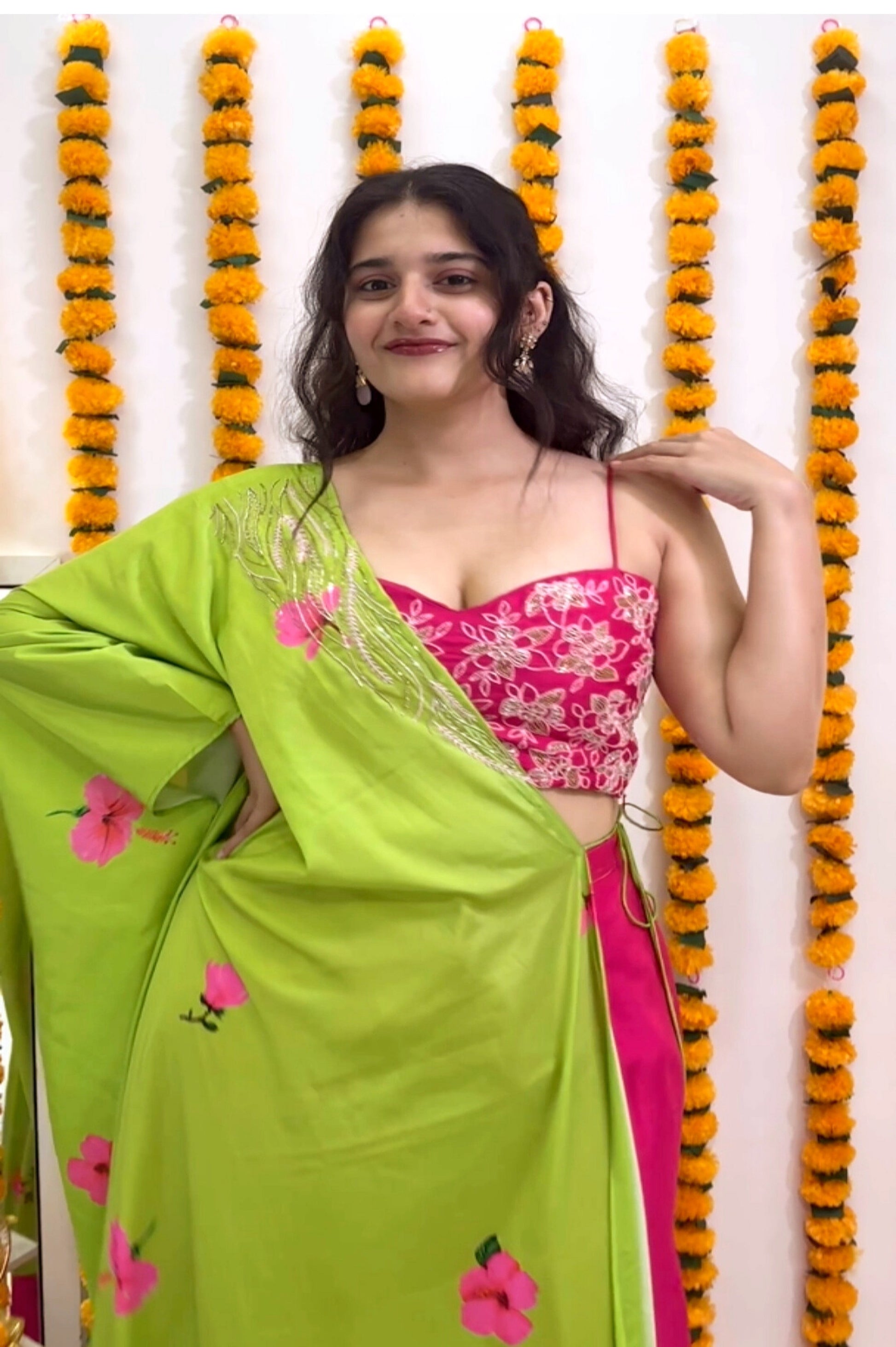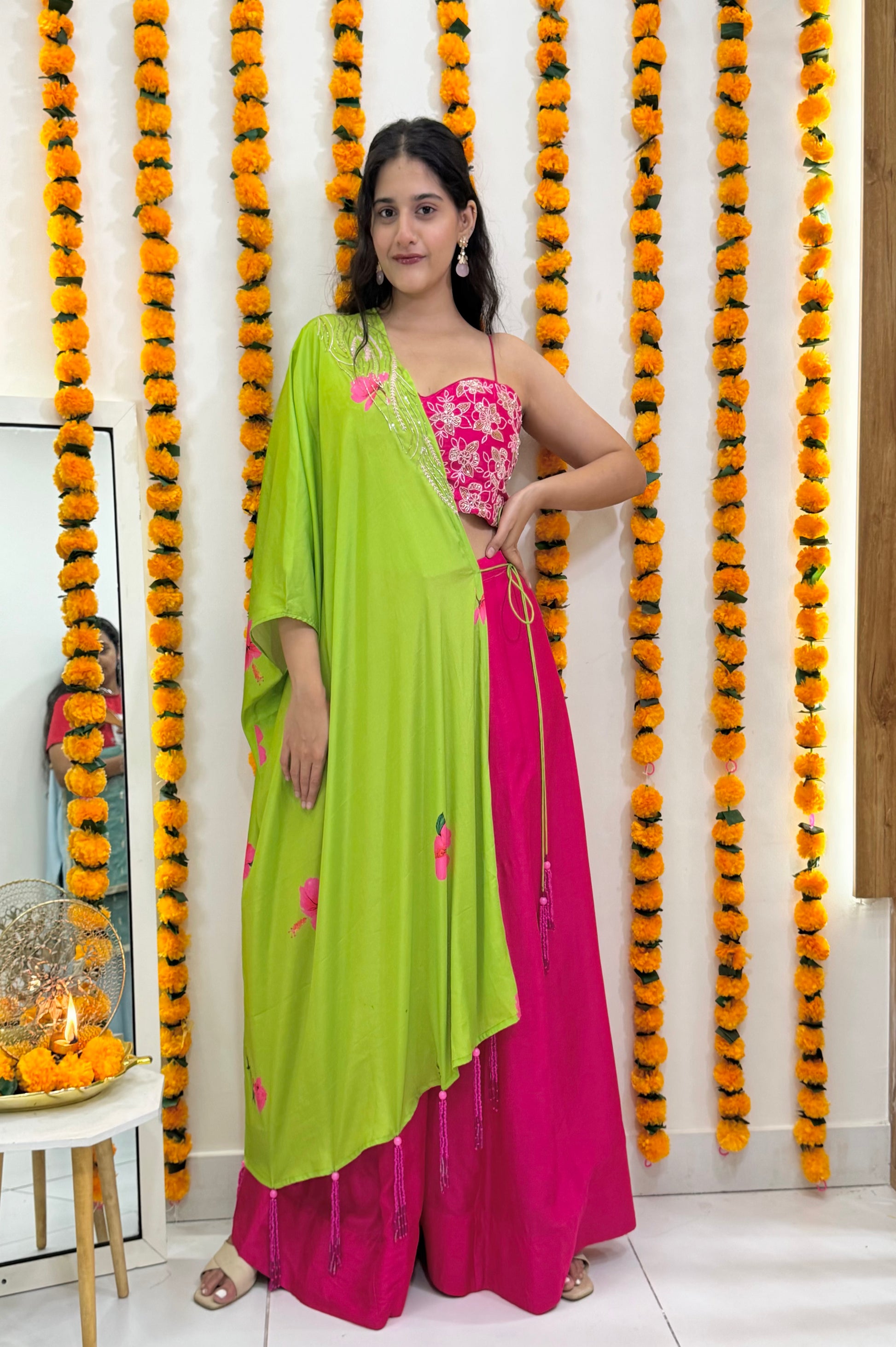 The intricate embroidery in one sided cape & blouse elevates the outfit's charm and individuality.