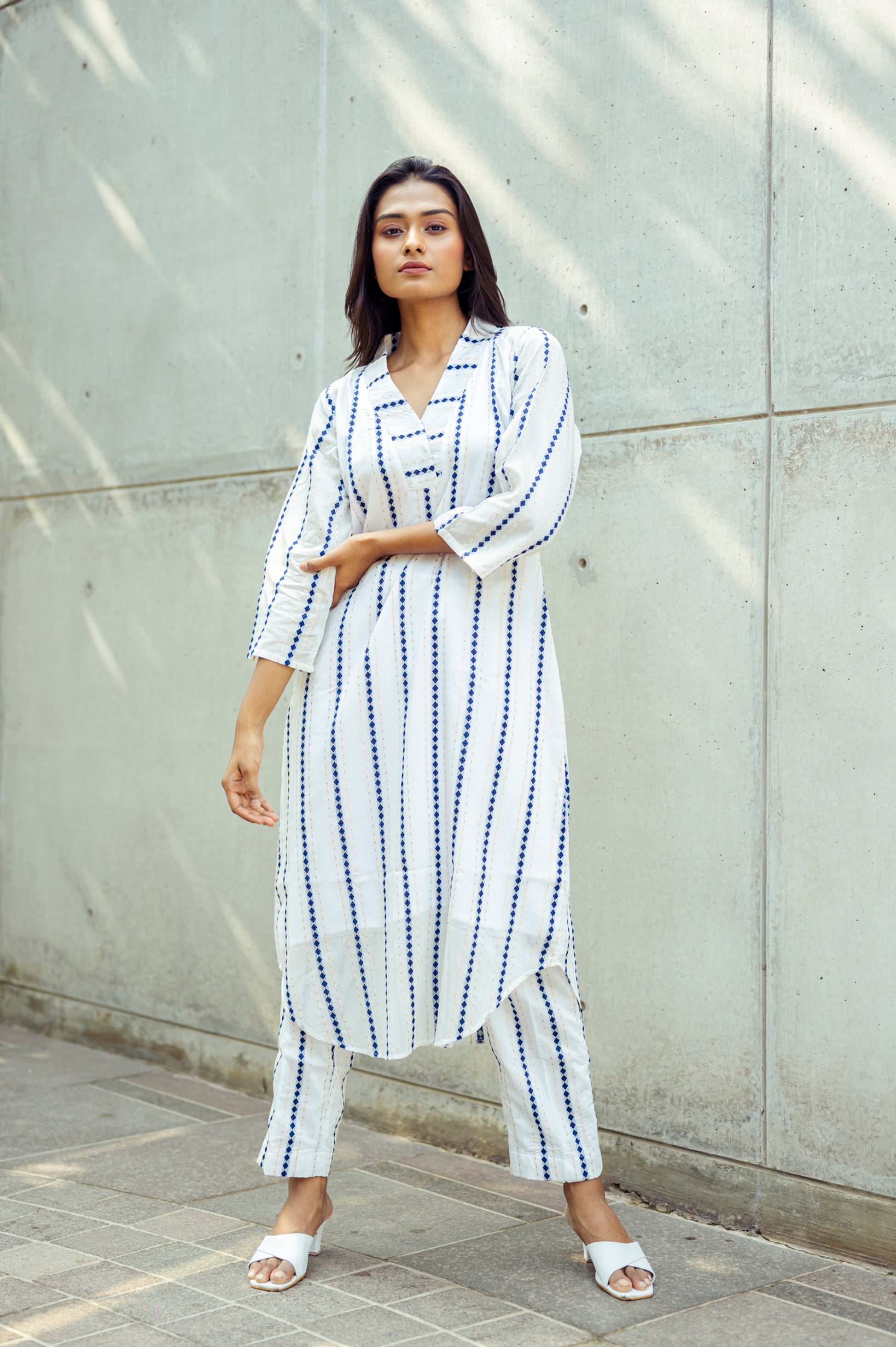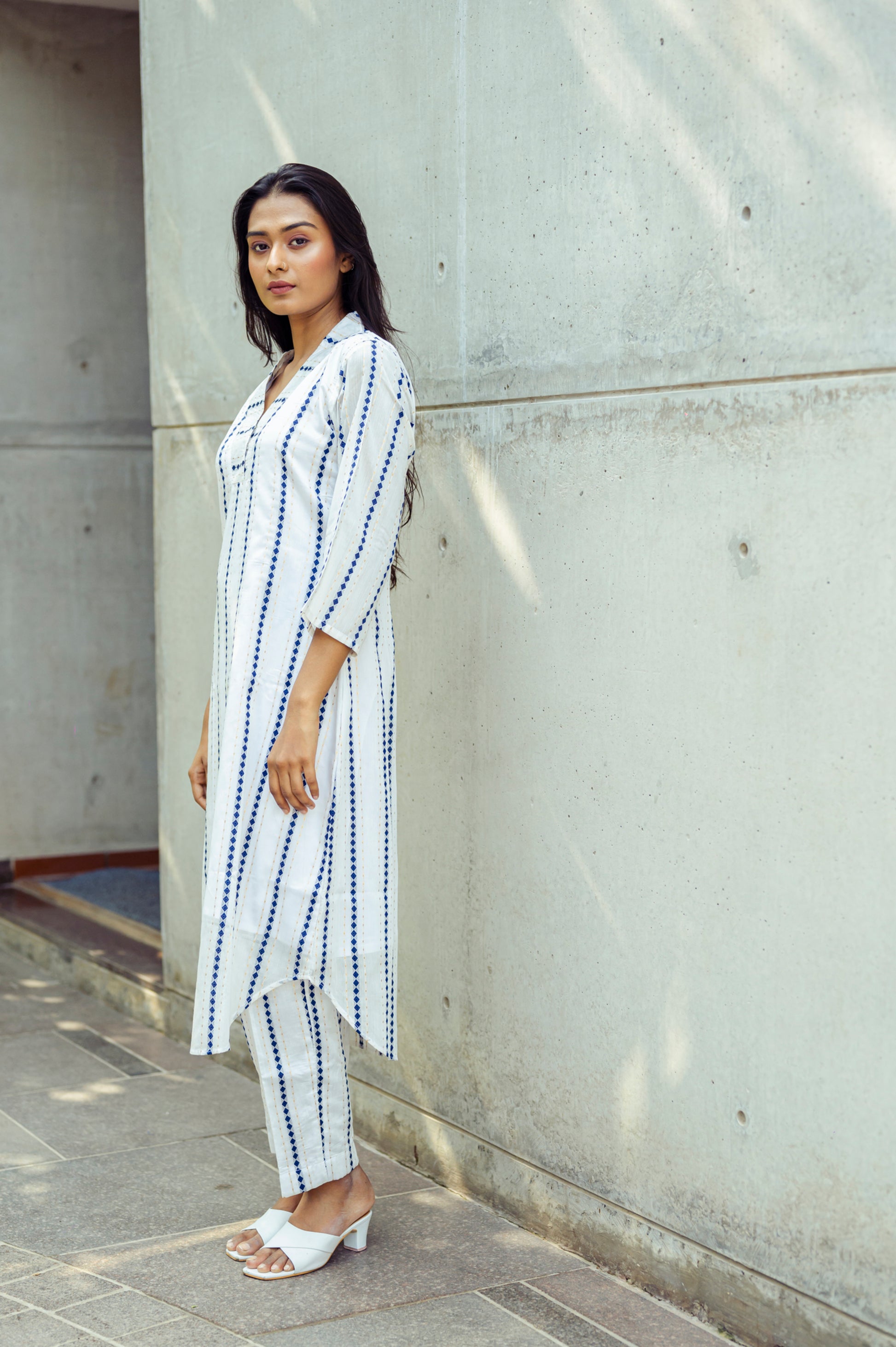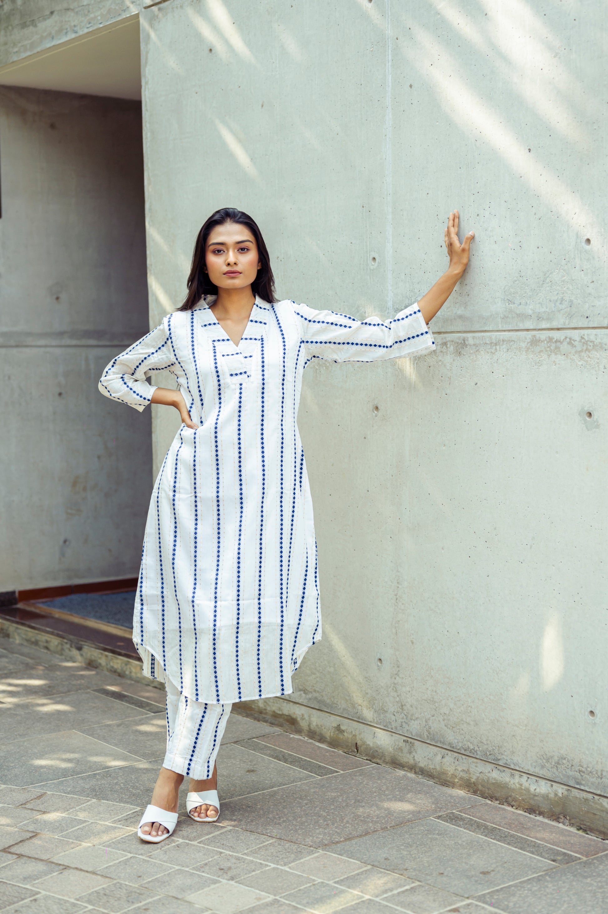Rozana Kurta Set is literally your everyday casual Indian outfit. Base fabric chanderi is weaved with blue and golden mina embroidery. Uniquely cut and crafted neckline and hemline adds style. It caters to your need for Indian outfit for office and everyday comfort wear. Pockets in pants makes it more functional.