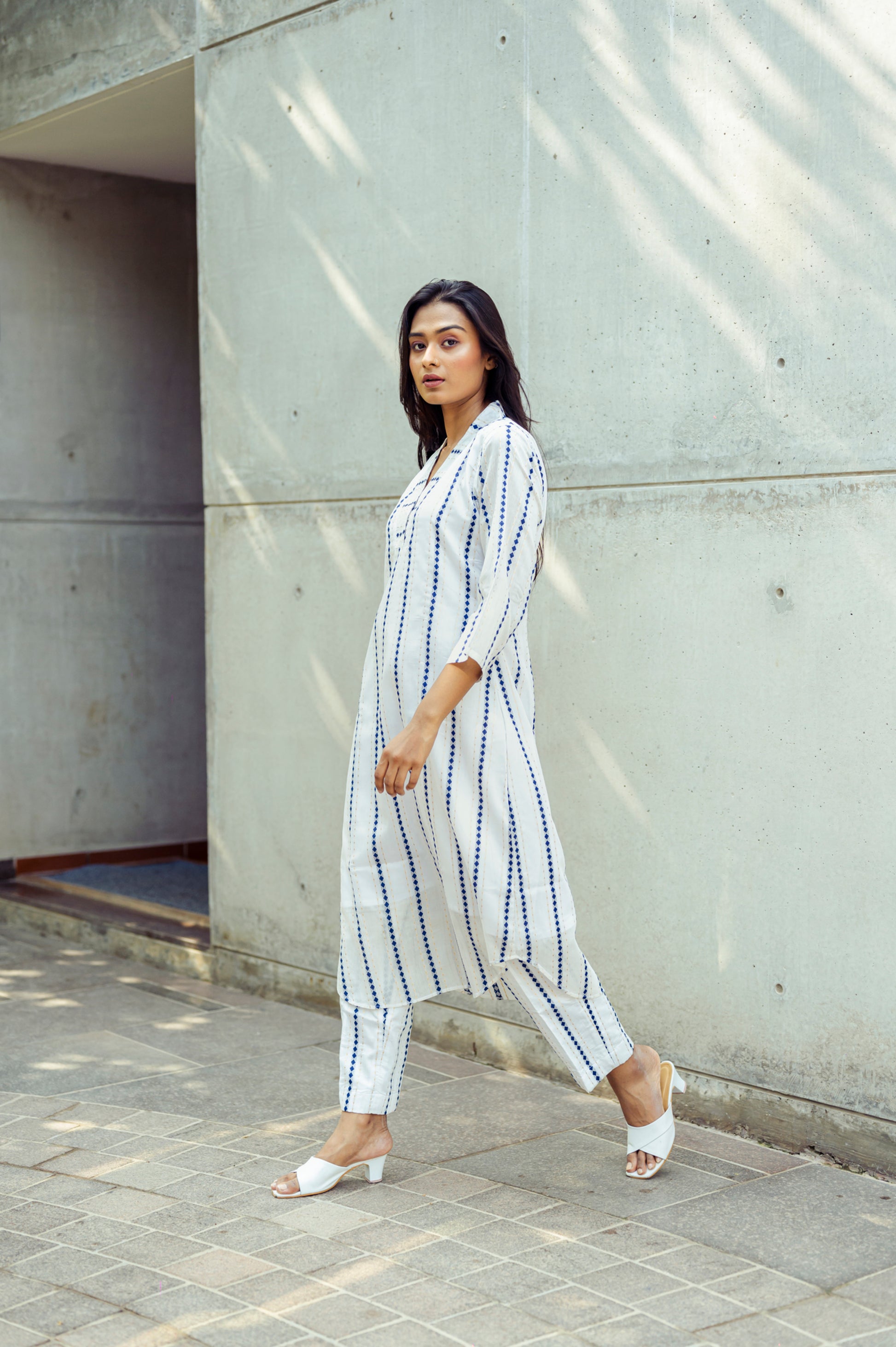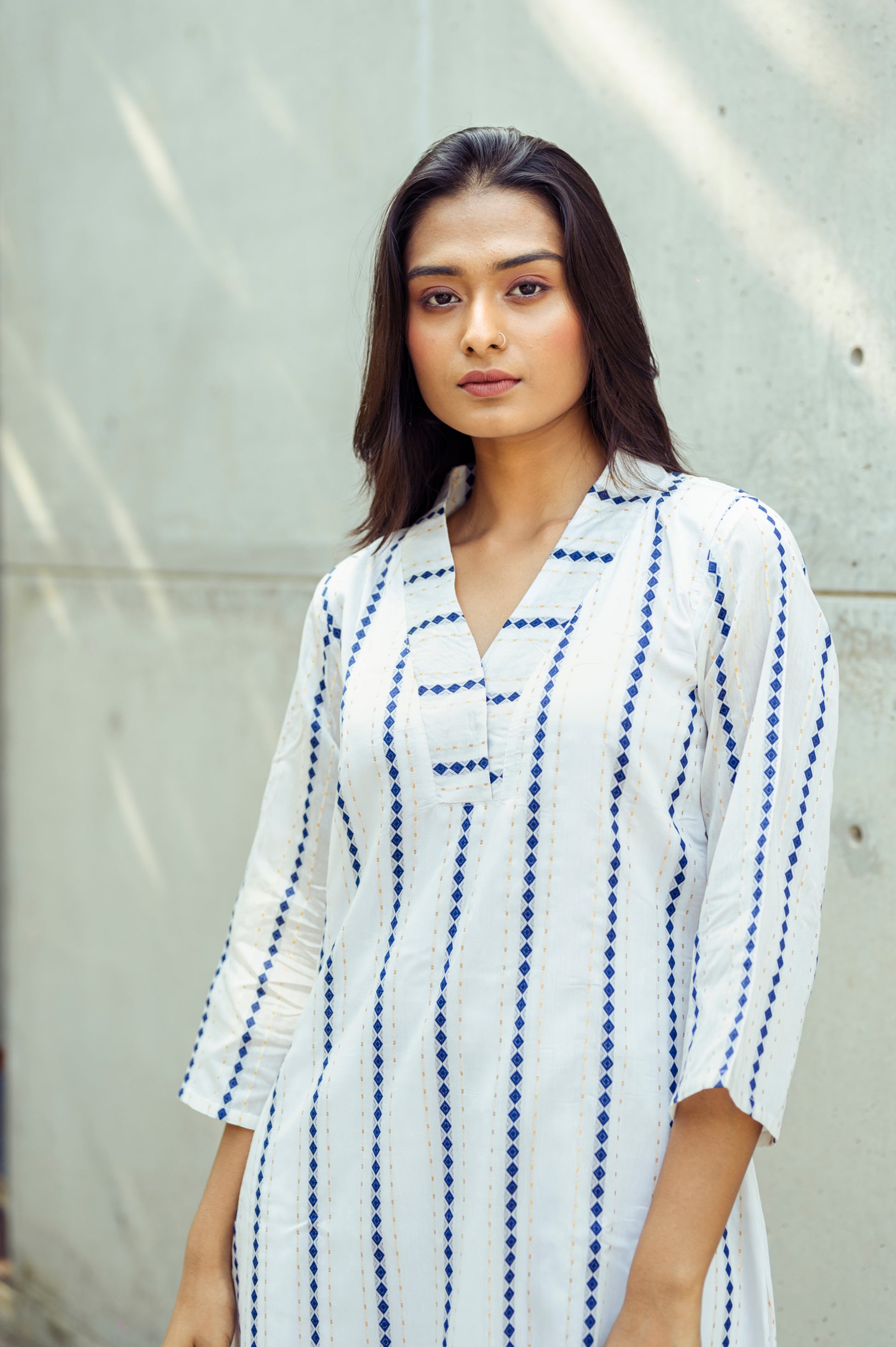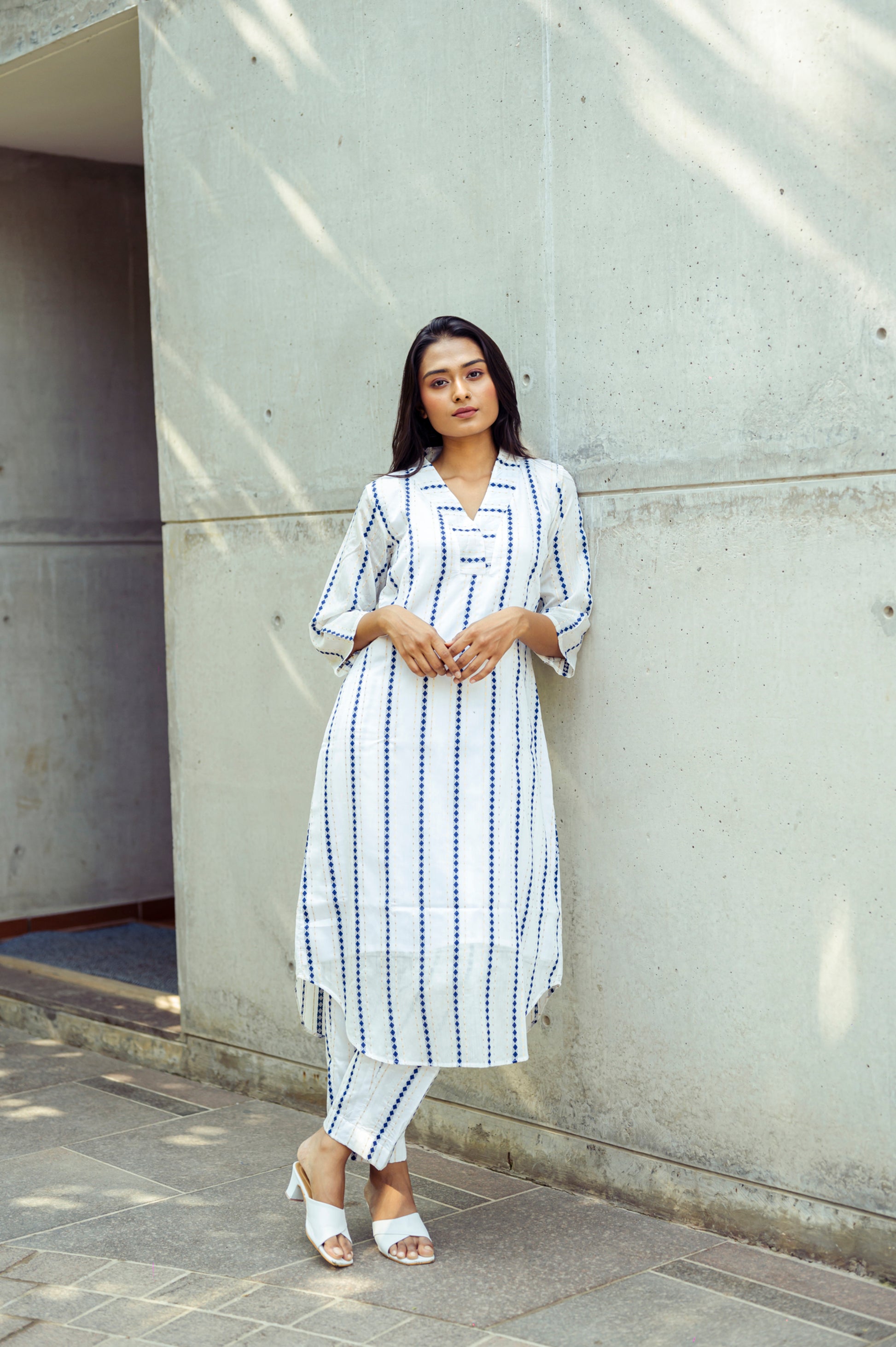 Rozana Kurta Set is literally your everyday casual Indian outfit. Base fabric chanderi is weaved with blue and golden mina embroidery. Uniquely cut and crafted neckline and hemline adds style. It caters to your need for Indian outfit for office and everyday comfort wear. Pockets in pants makes it more functional.