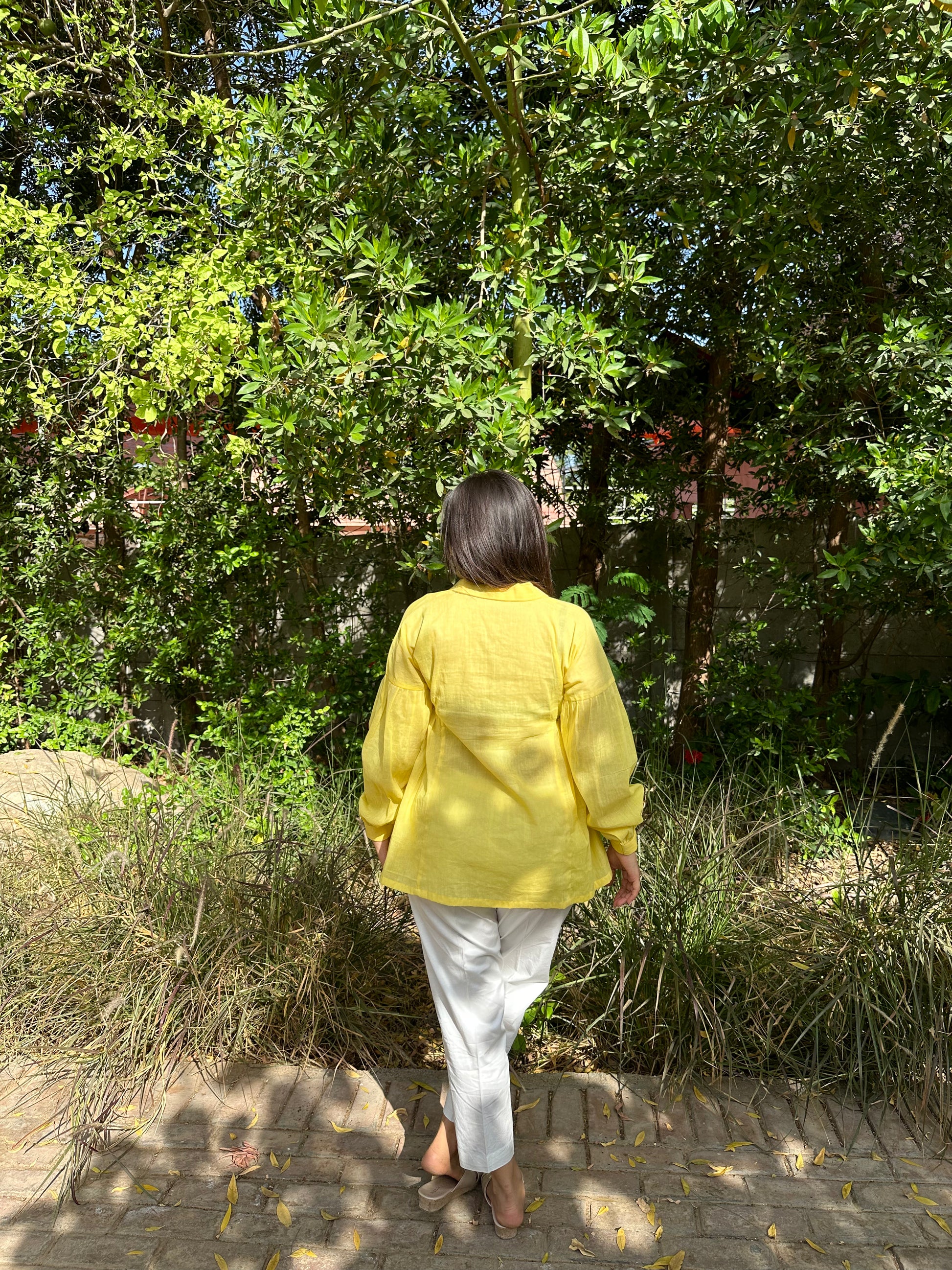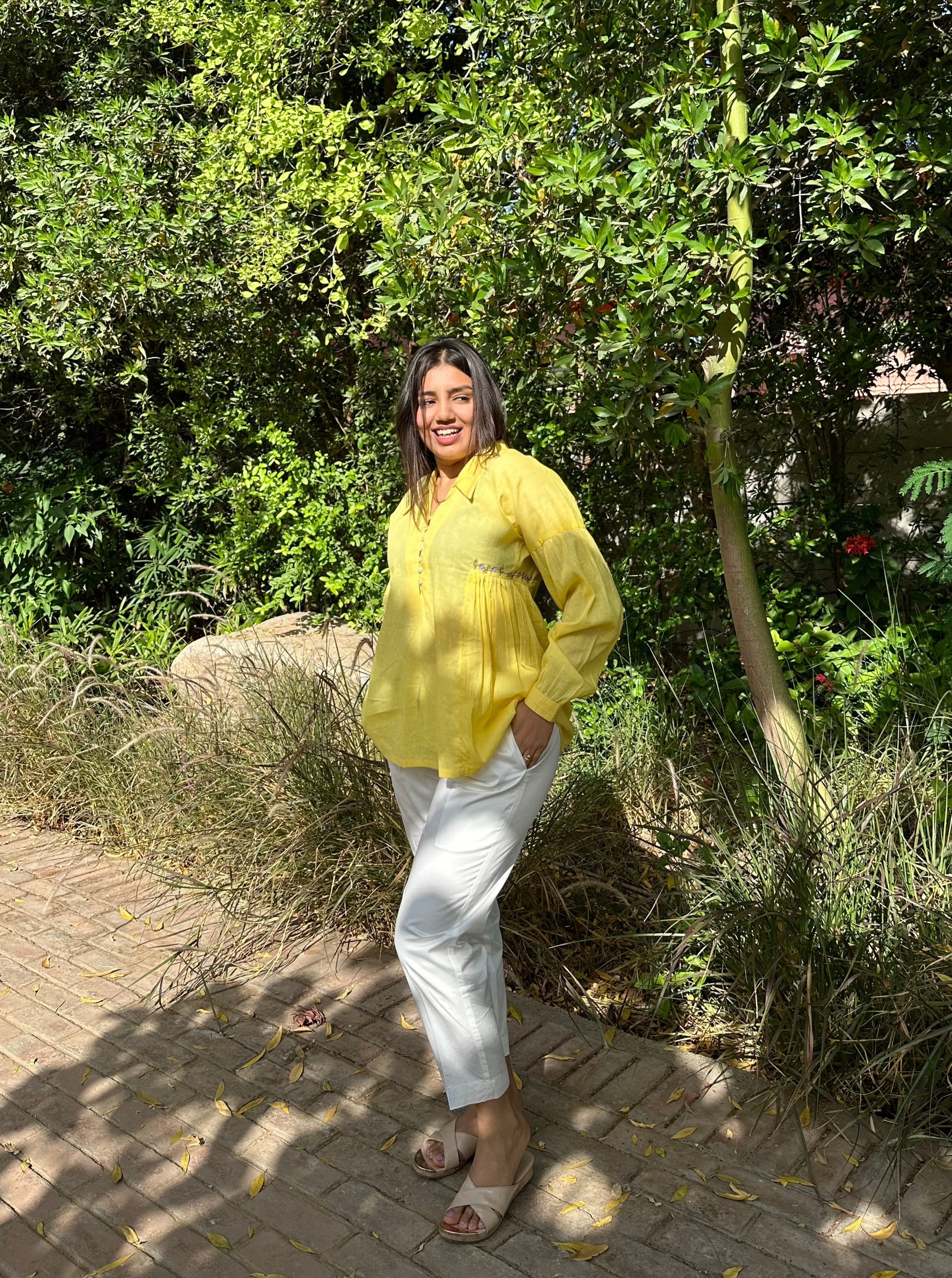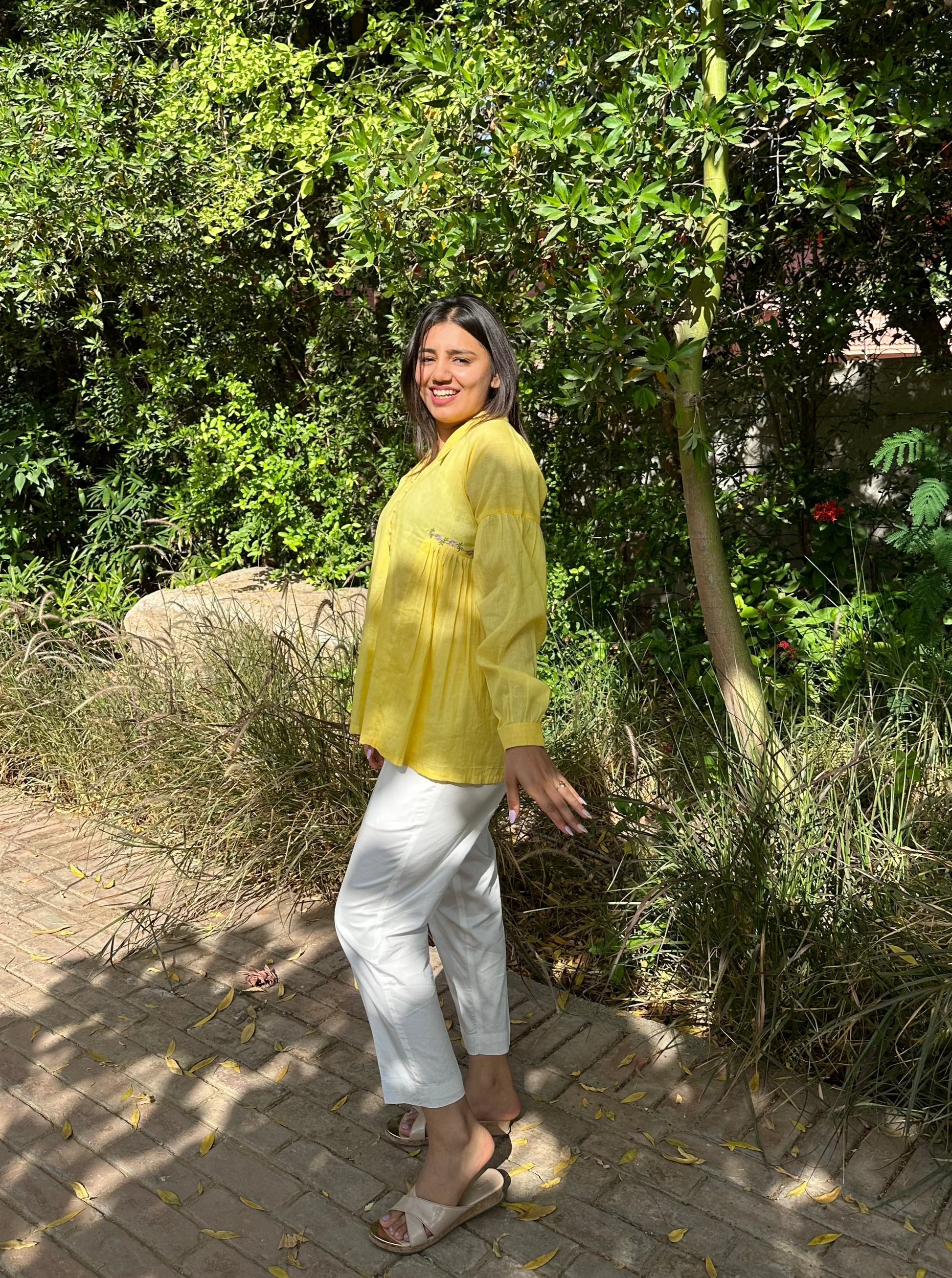 1. Elevate your summer style with our chic co-ord featuring a yellow embroidered mul cotton top paired elegantly with white cotton pants. The delicate embroidery adds a feminine touch, making it a must-have ensemble for the season.