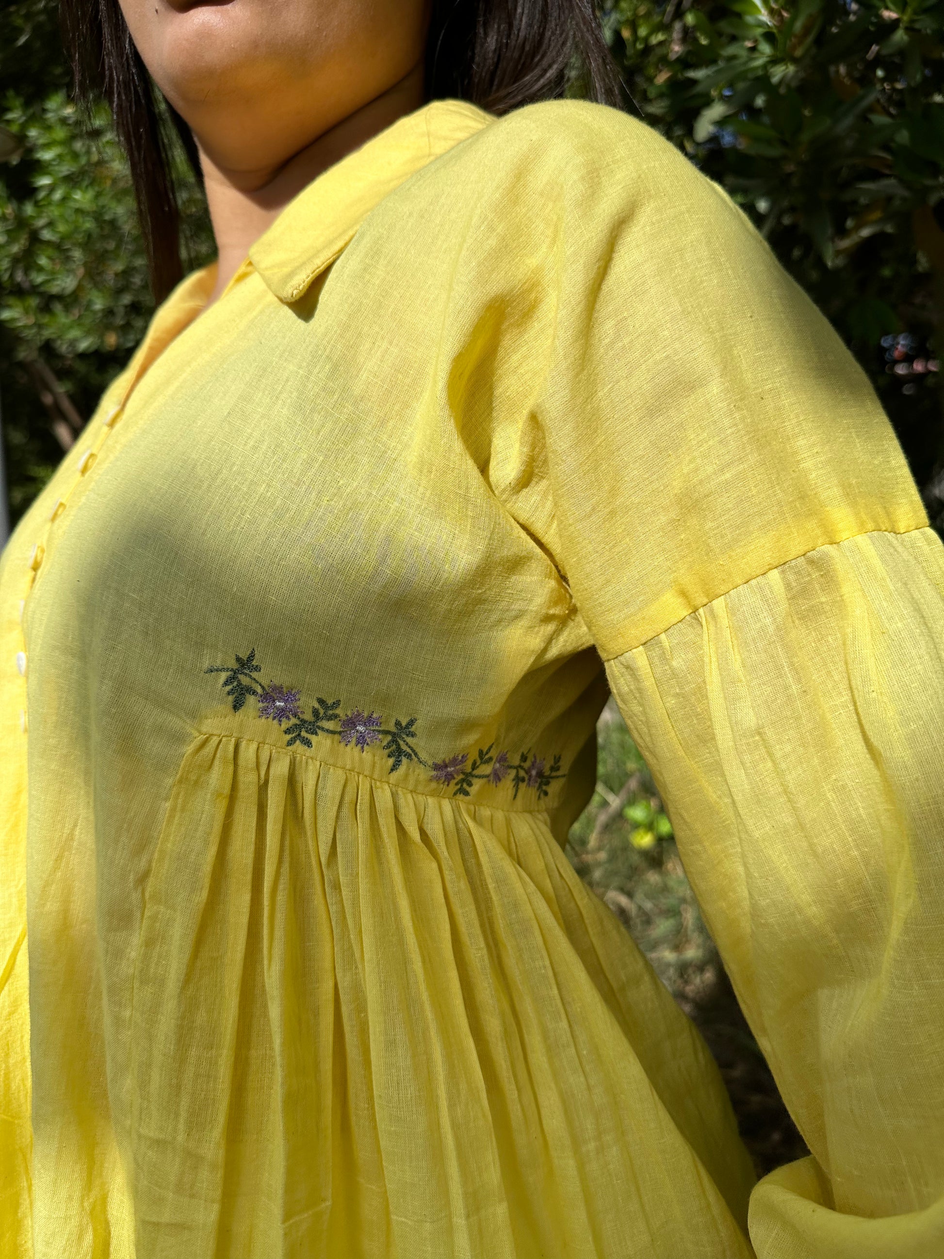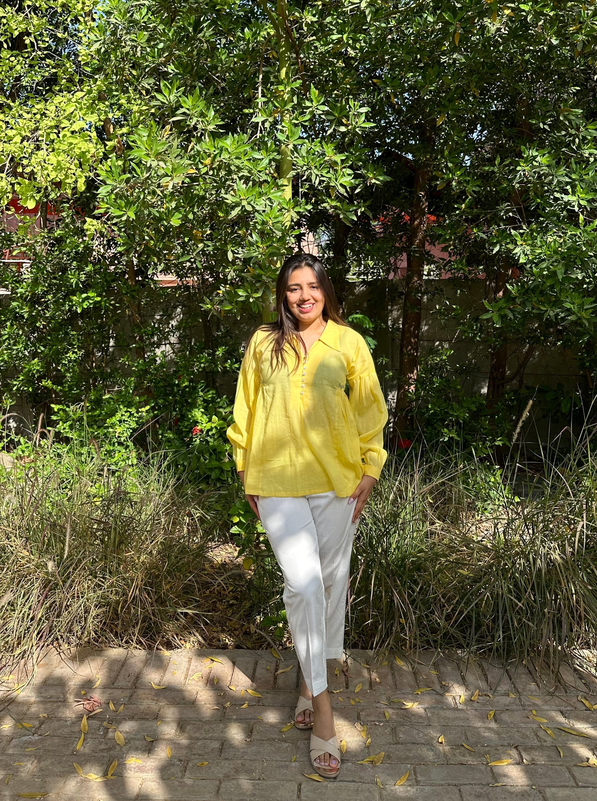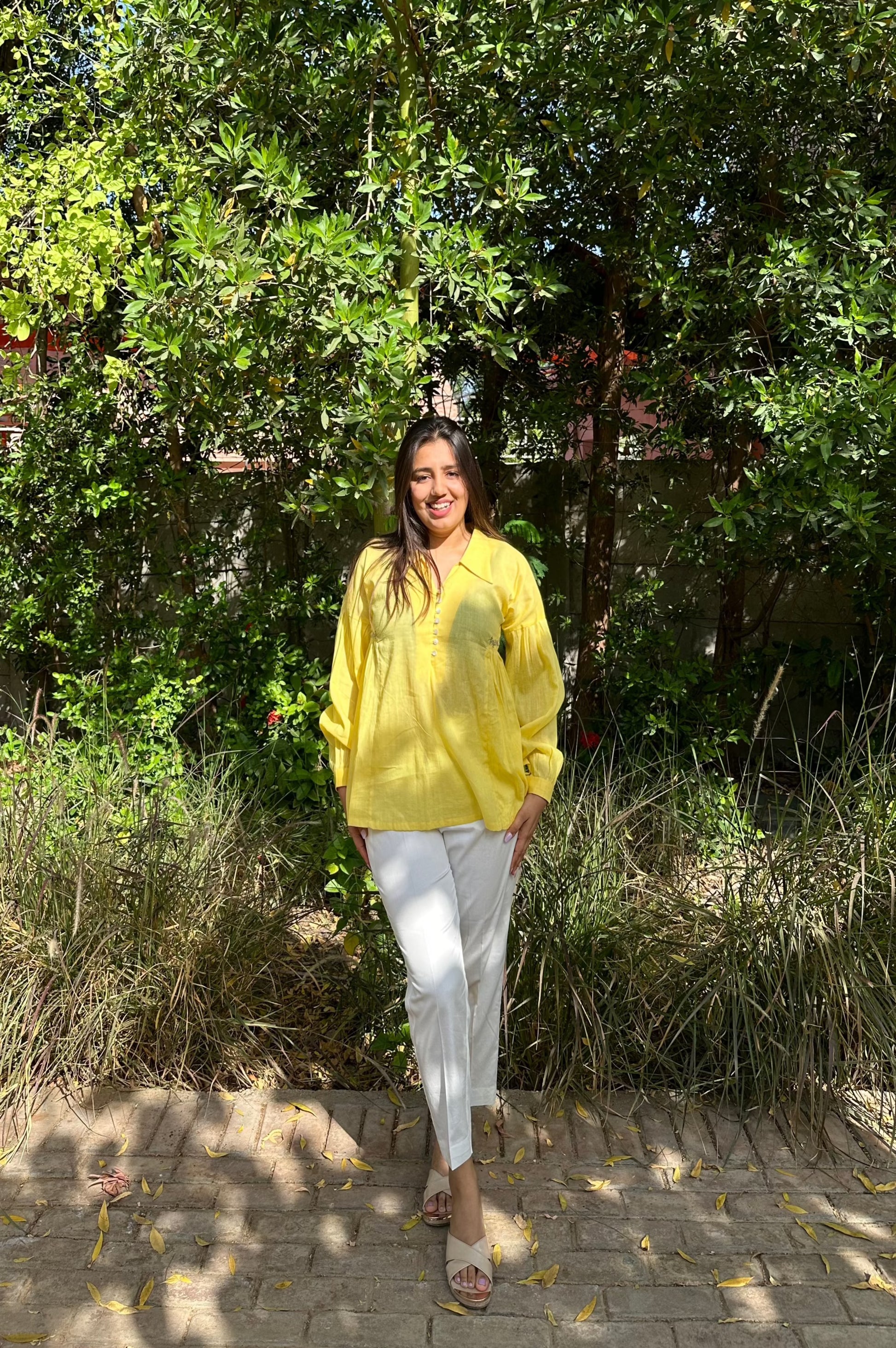 1. Elevate your summer style with our chic co-ord featuring a yellow embroidered mul cotton top paired elegantly with white cotton pants. The delicate embroidery adds a feminine touch, making it a must-have ensemble for the season.