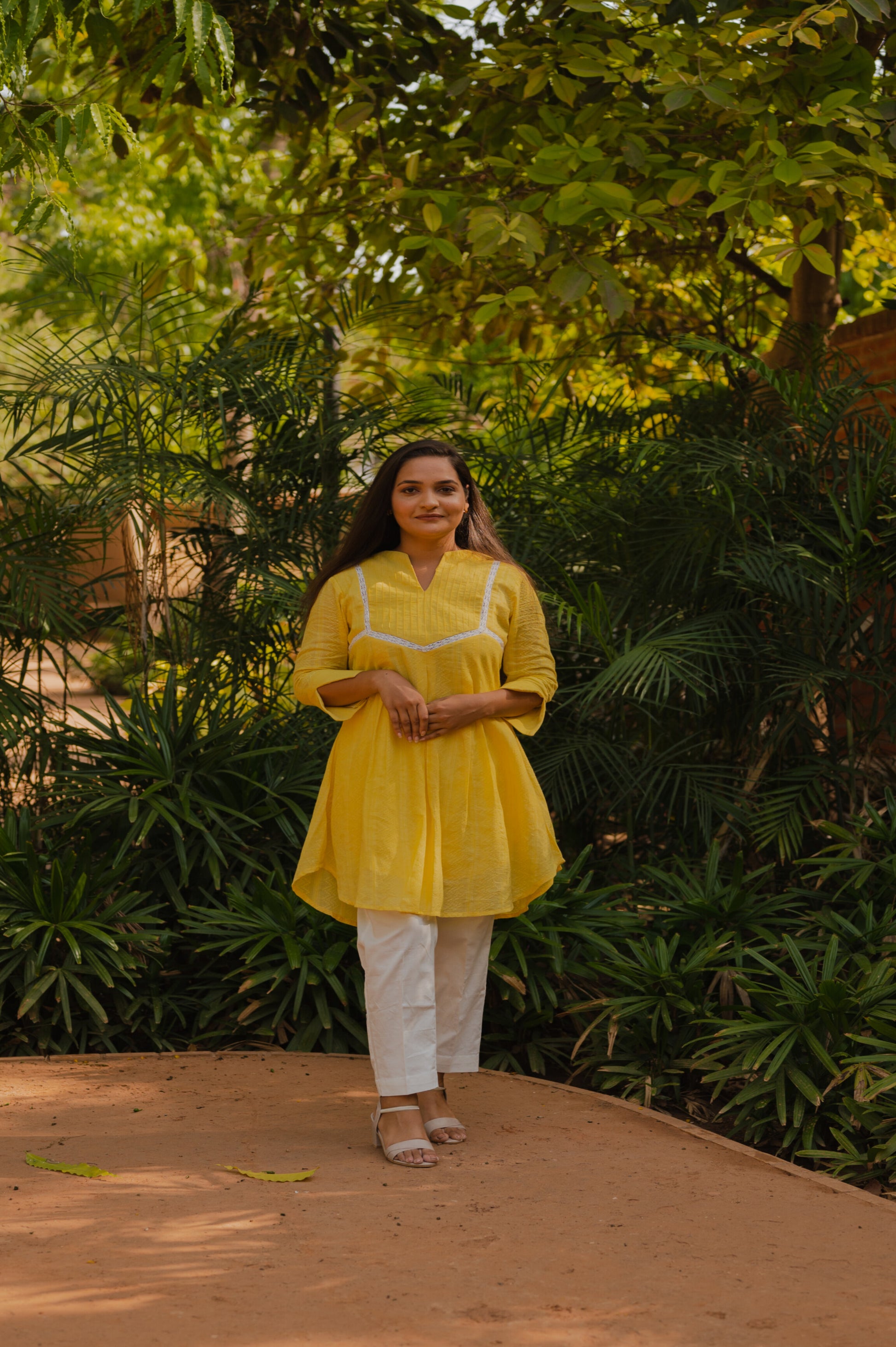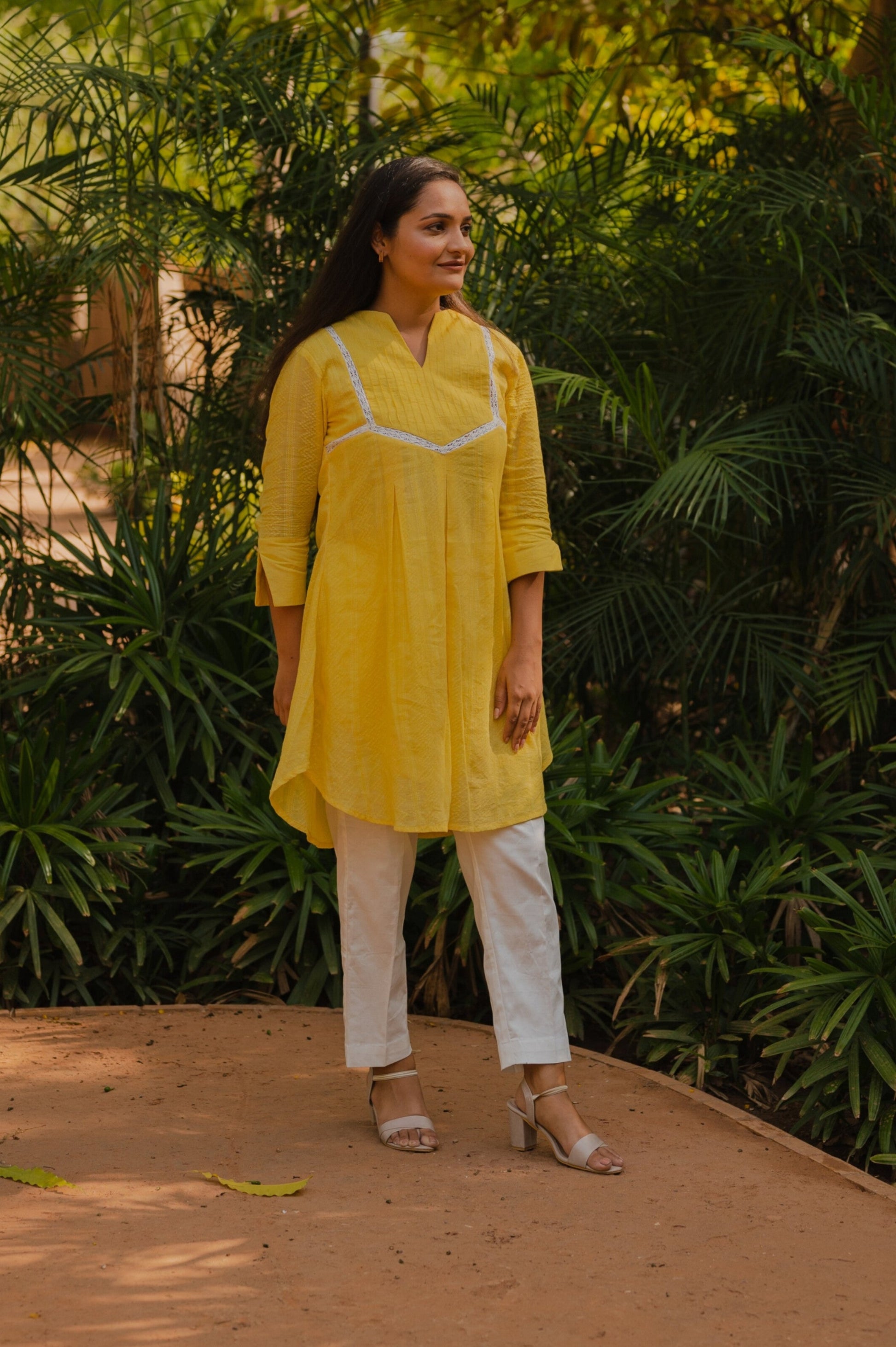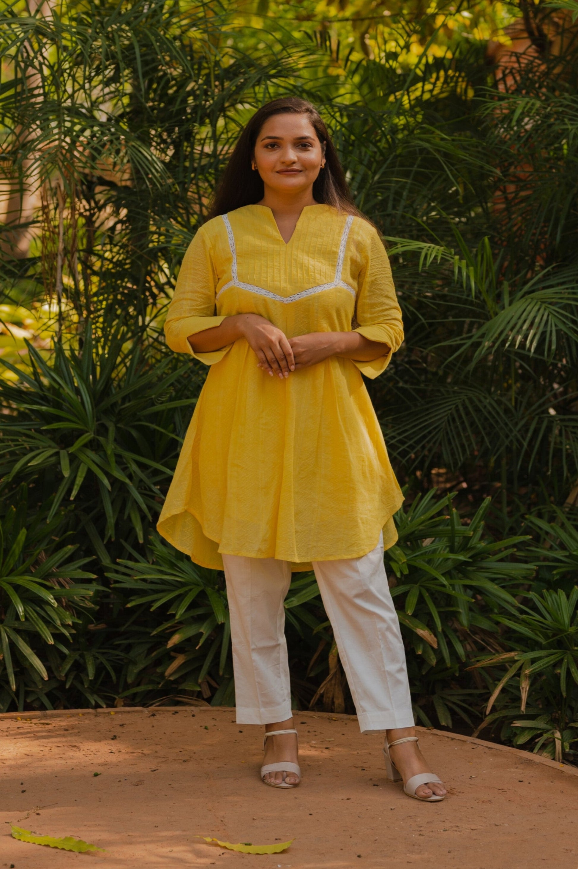 The self-designs on the cotton fabric create an intricate pattern that adds depth and texture, elevating the overall aesthetic of the Kurta set. The chic and classy detailing of lace and pleating on the body enhances the visual appeal of the set.